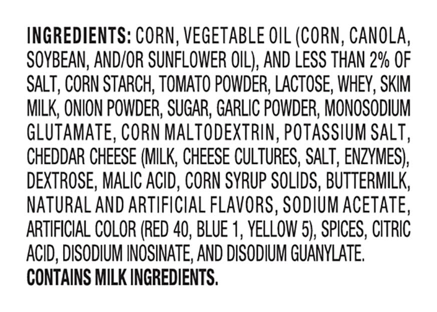 Ingredients: Corn, Vegetable Oil (Corn, Canola, Soybean, and/or Sunflower Oil), and Less than 2% of Salt, Corn Starch, Tomato Powder, Lactose, Whey, Skim Milk, Onion Powder, Sugar, Garlic Powder, Monosodium Glutamate, Corn Maltodextrin, Potassium Salt, Cheddar Cheese (Milk, Cheese Cultures, Salt, Enzymes), Dextrose, Malic Acid, Corn Syrup Solids, Buttermilk, Natural and Artificial Flavors, Sodium Acetate, Artificial Color (Red 40, Blue 1, Yellow 5), Spices, Citric Acid, Disodium Inosinate, and Disodium Guanylate Contains: Milk, Corn, Lactose, Soybeans