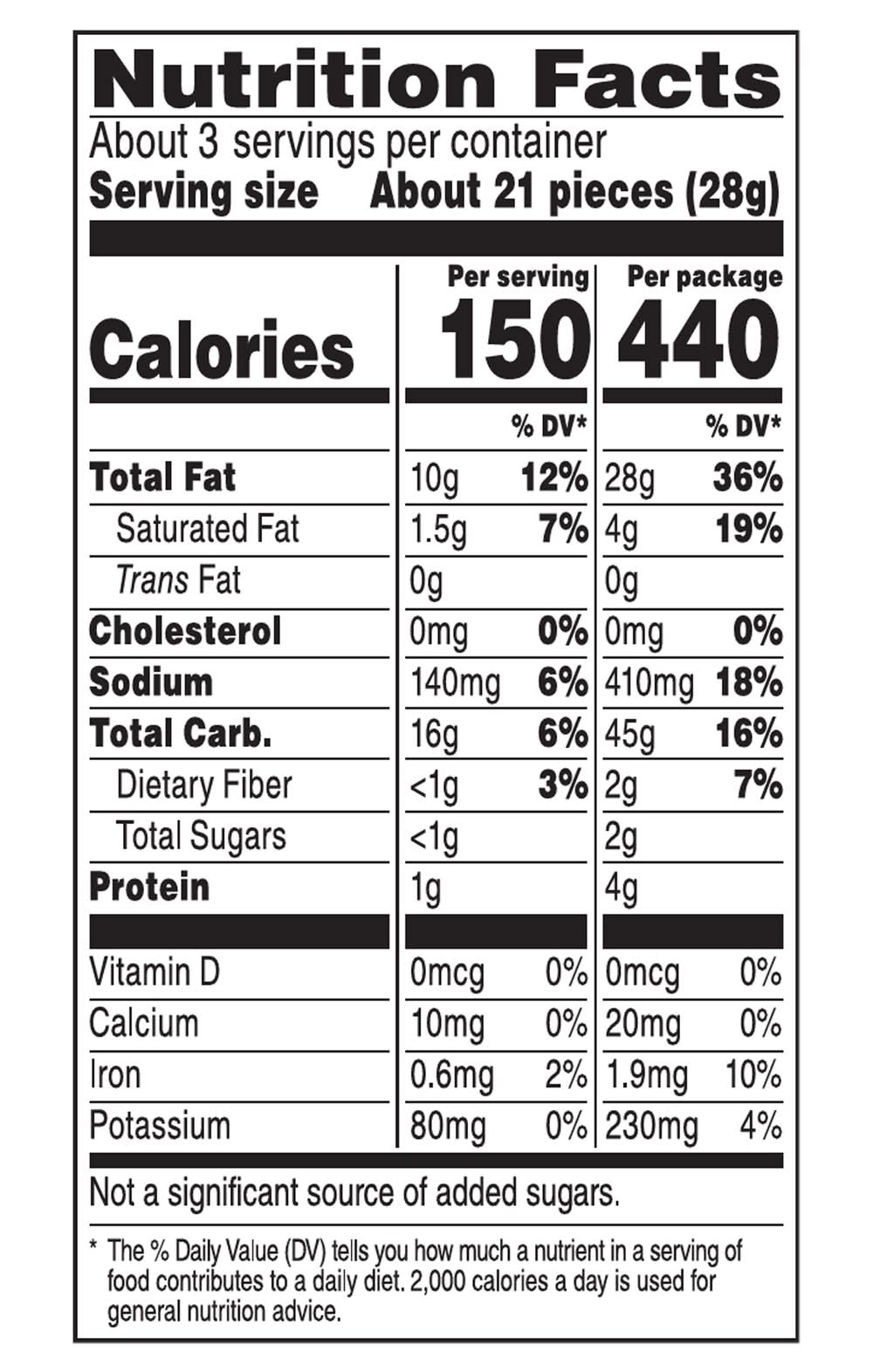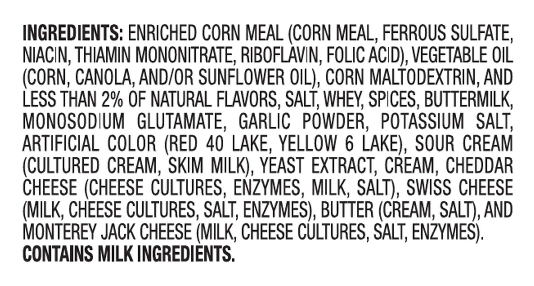 Ingredients: Enriched Corn Meal (Corn Meal, Ferrous Sulfate, Niacin, Thiamin Mononitrate, Riboflavin, Folic Acid), Vegetable Oil (Corn, Canola, and/or Sunflower Oil), Corn Maltodextrin, and Less than 2% of Natural Flavors, Salt, Whey, Spices, Buttermilk, Monosodium Glutamate, Garlic Powder, Potassium Salt, Artificial Color (Red 40 Lake, Yellow 6 Lake), Sour Cream (Cultured Cream, Skim Milk), Yeast Extract, Cream, Cheddar Cheese (Cheese Cultures, Enzymes, Milk, Salt), Swiss Cheese (Milk, Cheese Cultures, Salt, Enzymes), Butter (Cream, Salt), and Monterey Jack Cheese (Milk, Cheese Cultures, Salt, Enzymes) Contains: Corn, Milk