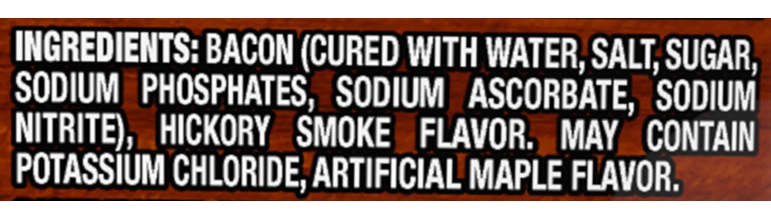 Ingredients: Bacon (Cured with Water, Salt, Sugar, Sodium Phosphates, Sodium Ascorbate, Sodium Nitrite), Hickory Smoke Flavor
