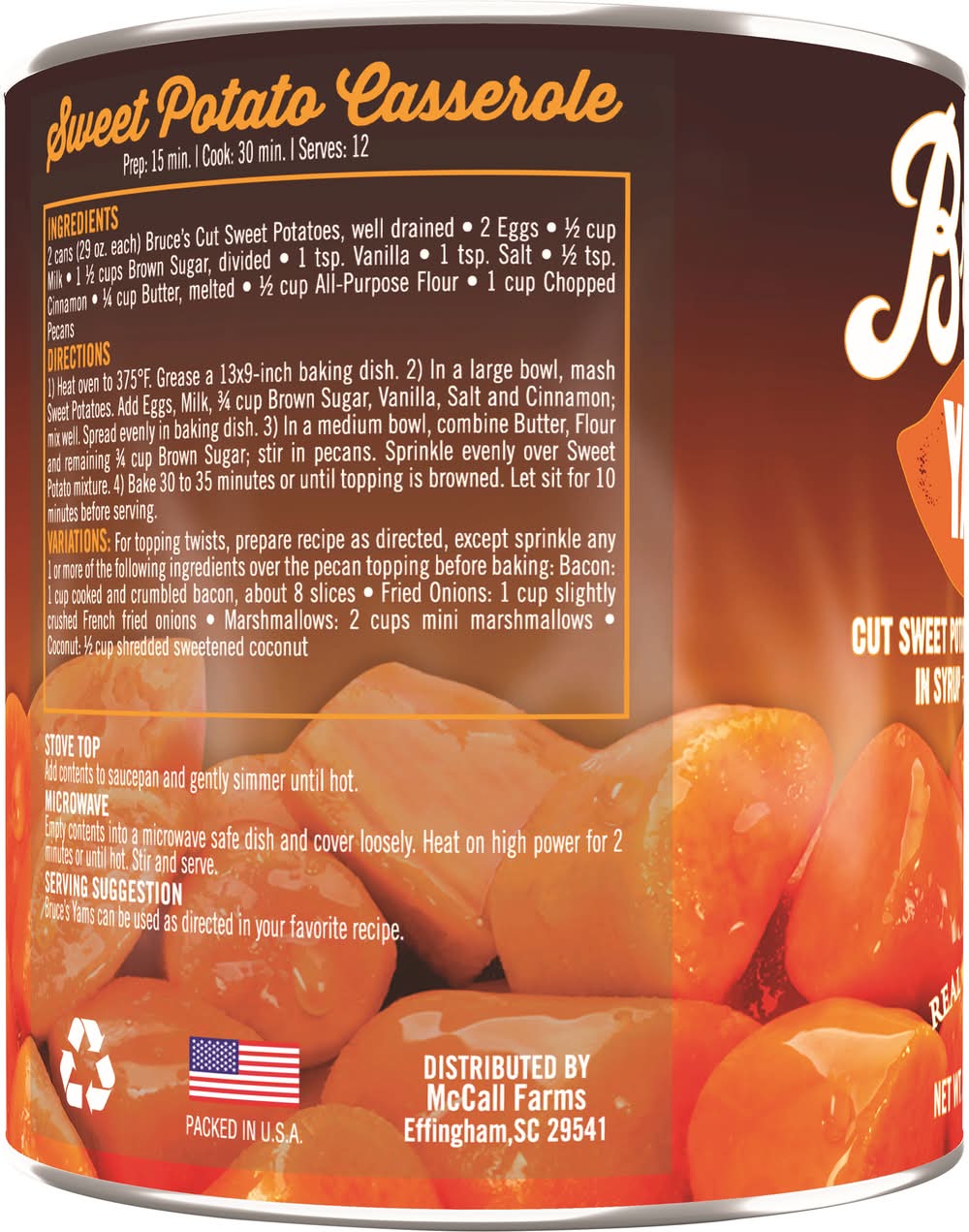No artificial flavors. Naturally Gluten Free American Heart Association Certified: Meets criteria for heart-healthy food. Heart-check certification does not apply to these recipes. Diets low in saturated fat and cholesterol, and as low as possible in trans-fat, may reduce the risk of heart disease. Good source of vitamin A and beta carotene. Family owned. Est. '28. Real Southern style. Discover Earth’s Natural Benefits! All natural with no additives. When contacting us, please reference the code from the lid of the can. Family owned USA grown. • McCall Farms, Inc, Effingham, SC, 29541 • Packaging: Reusable
