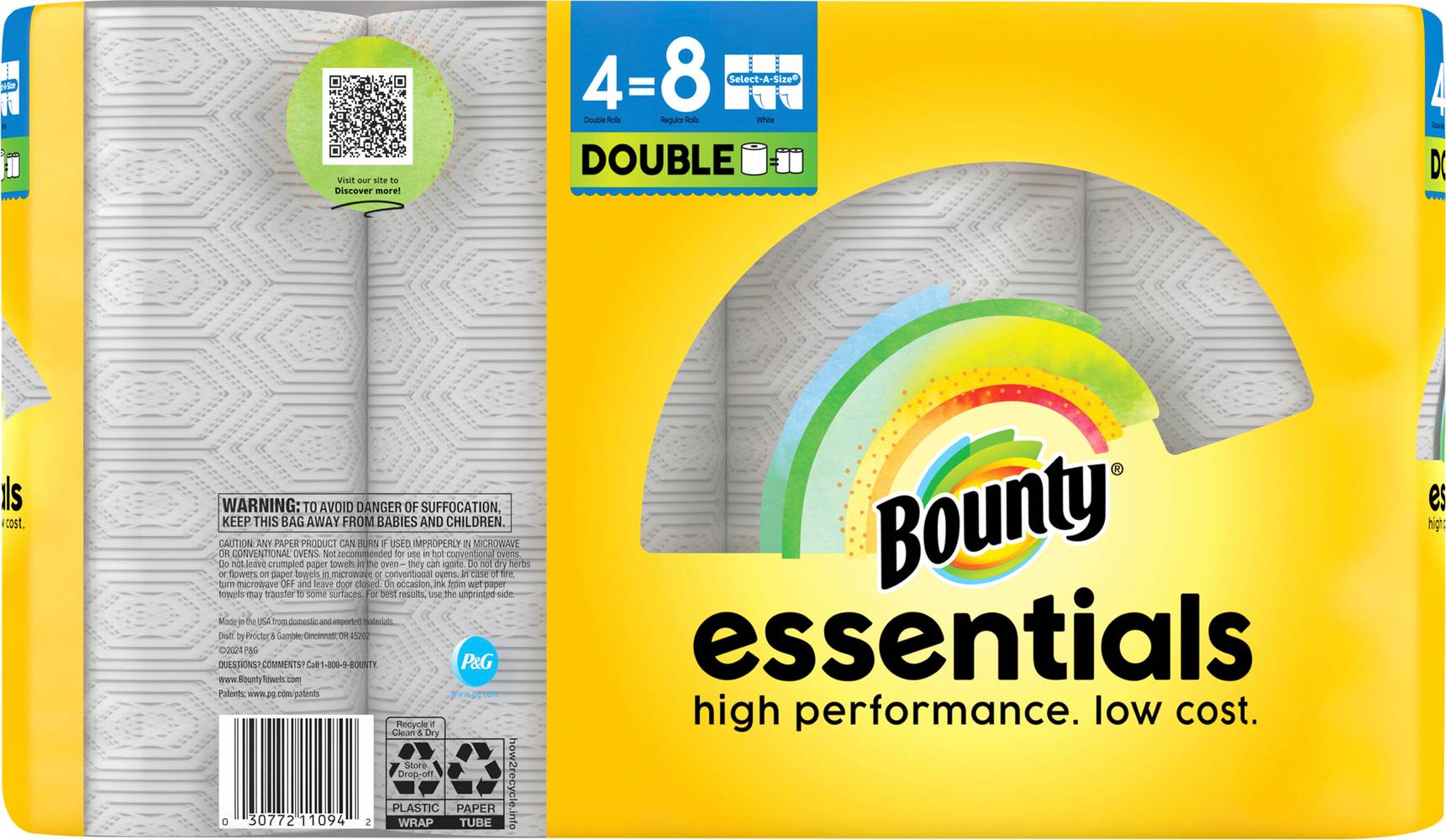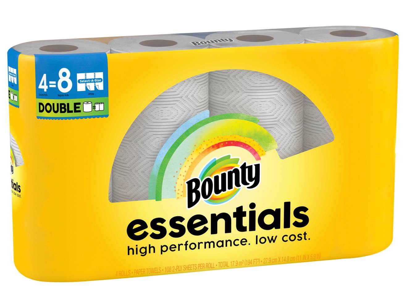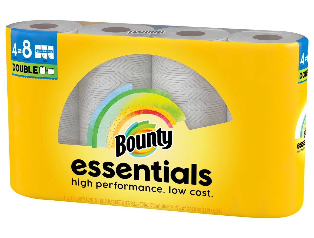 Cheap stuff not holding up? That's why we made Bounty Essentials, where high performance meets low cost. This pack contains Bounty Essentials Select-A-Size white paper towels that are strong enough to handle multiple messes and soft enough to use on your family. And with Select-A-Size sheets you can decide how much you use depending on your mess. Affordable durability for everyday messes. • Color: White • Size: 11x5.9 in • Packaging: Reusable