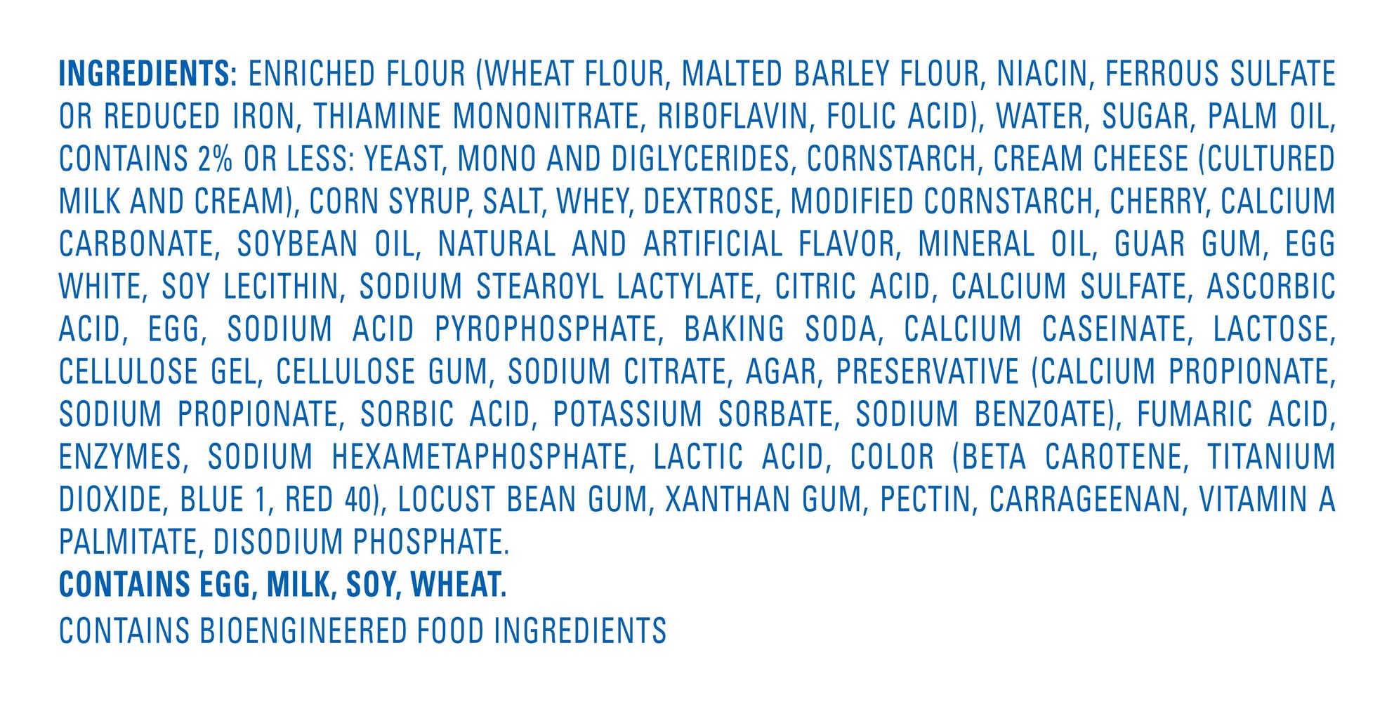 Ingredients: Enriched Flour (Wheat Flour, Malted Barley Flour, Niacin, Ferrous Sulfate Or Reduced Iron, Thiamine Mononitrate, Riboflavin, Folic Acid), Water, Sugar, Palm Oil, Contains 2% Or Less: Yeast, Mono And Diglycerides, Cornstarch, Cream Cheese (Cultured Milk And Cream), Corn Syrup, Salt, Whey, Dextrose, Modified Cornstarch, Cherry, Calcium Carbonate, Soybean Oil, Natural And Artificial Flavor, Mineral Oil, Guar Gum, Egg White, Soy Lecithin, Sodium Stearoyl Lactylate, Citric Acid, Calcium Sulfate, Ascorbic Acid, Egg, Sodium Acid Pyrophosphate, Baking Soda, Calcium Caseinate, Lactose, Cellulose Gel, Cellulose Gum, Sodium Citrate, Agar, Preservative (Calcium Propionate, Sodium Propionate, Sorbic Acid, Potassium Sorbate, Sodium Benzoate), Fumaric Acid, Enzymes, Sodium Hexametaphosphate, Lactic Acid, Color (Beta Carotene, Titanium Dioxide, Blue 1, Red 40), Locust Bean Gum, Xanthan Gum, Pectin, Carrageenan, Vitamin A Palmitate, Disodium Phosphate. Contains Egg, Milk, Soy, Wheat. Contains Bioengineered Food Ingredients Contains: Contains Egg, Milk, Soy, Wheat. Contains Bioengineered Food Ingredients