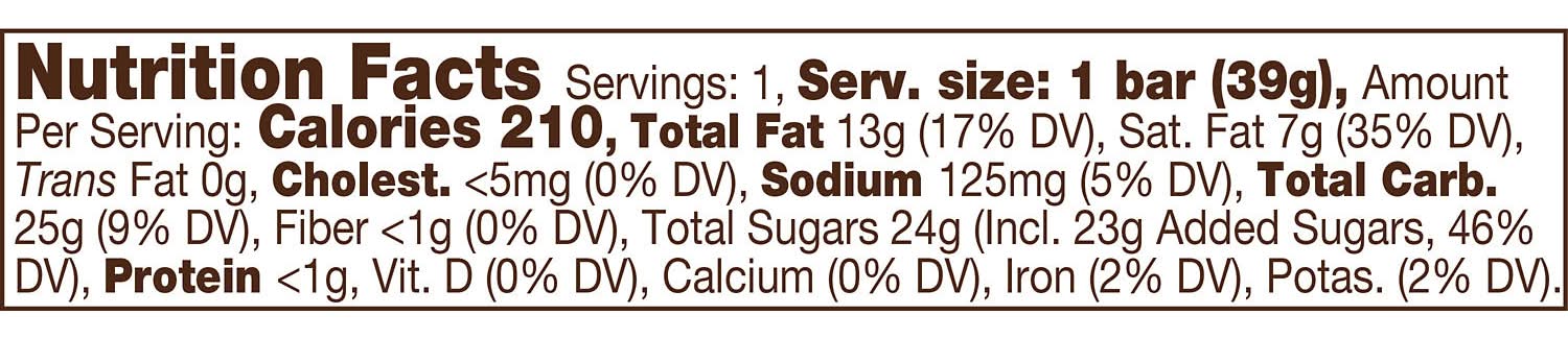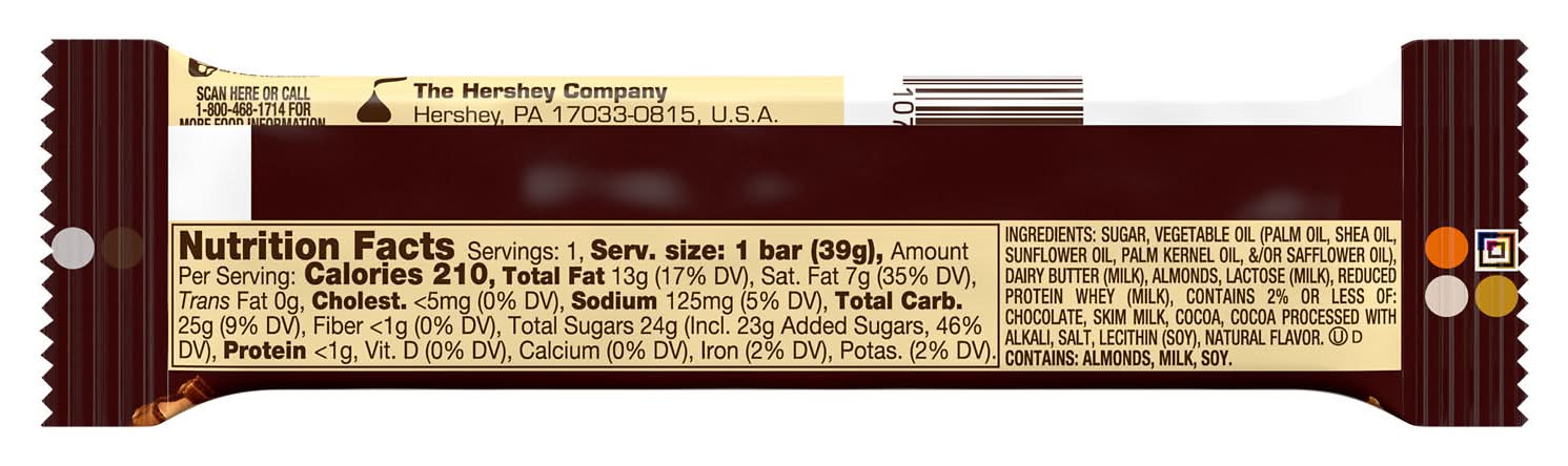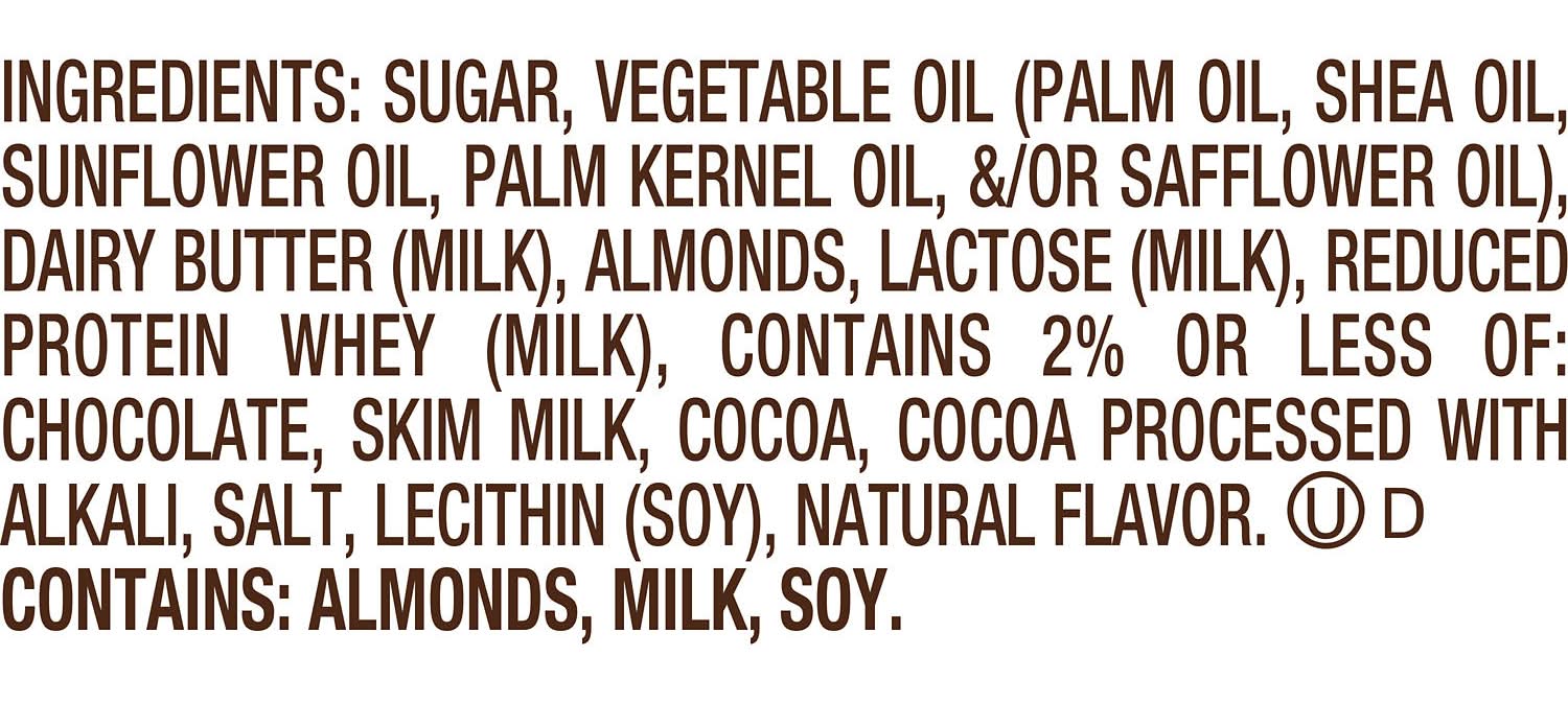 Ingredients: SUGAR, VEGETABLE OIL (PALM OIL, SHEA OIL, SUNFLOWER OIL, PALM KERNEL OIL, /OR SAFFLOWER OIL), DAIRY BUTTER (MILK), ALMONDS, LACTOSE (MILK), REDUCED PROTEIN WHEY (MILK), CONTAINS 2% OR LESS OF: CHOCOLATE, SKIM MILK, COCOA, COCOA PROCESSED WITH ALKALI, SALT, LECITHIN (SOY), NATURAL FLAVOR. Contains: Contains: Almonds|Soy|Milk