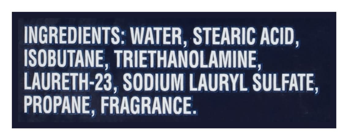 Ingredients: Water, Stearic Acid, Isobutane, Triethanolamine, Laureth-23, Sodium Lauryl Sulfate, Propane, Fragrance