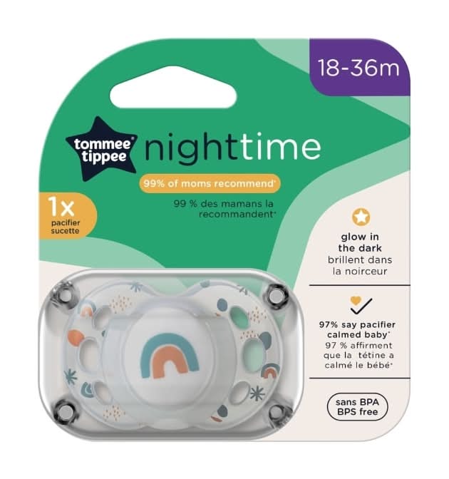 The instinctive action of sucking helps to calm and soothe babies and all parents know theres nothing more wonderful than a calm, content baby. So, when you need to turn screams and sobs into smiles and sleep, simply pick up a Tommee Tippee night time pacifier. Our night time pacifiers feature ingenious glow in the dark handles, so parents can locate the pacifier in a dark room without having to disturb baby. Our pacifier packs feature a reusable sterilizer pod that can be used to effectively and efficiently sterilize up to 2 pacifiers at once in a microwave, killing up to 99.9% of bacteria. As the symmetrical silicone baglet is fully reversible, there is no wrong side-up so the pacifier will always be placed correctly in your babys mouth, even when they put it in their mouth themselves. The curved shield sits comfortably between babys chin and nose and the holes in each side allow extra air flow and prevent the build-up of moisture which helps to protect babys delicate skin against irritation. The BPA-free silicone baglet is soft and flexible whilst also being robust and durable. The smooth surface of silicone is very easy to clean and wont absorb stains and odors. Simply pop in a sterilizer, wash by hand or in the dishwasher. We recommend against prolonged pacifier use over 24 months and stopping pacifier use when your child is older than 36 months. Size: 18-36M
