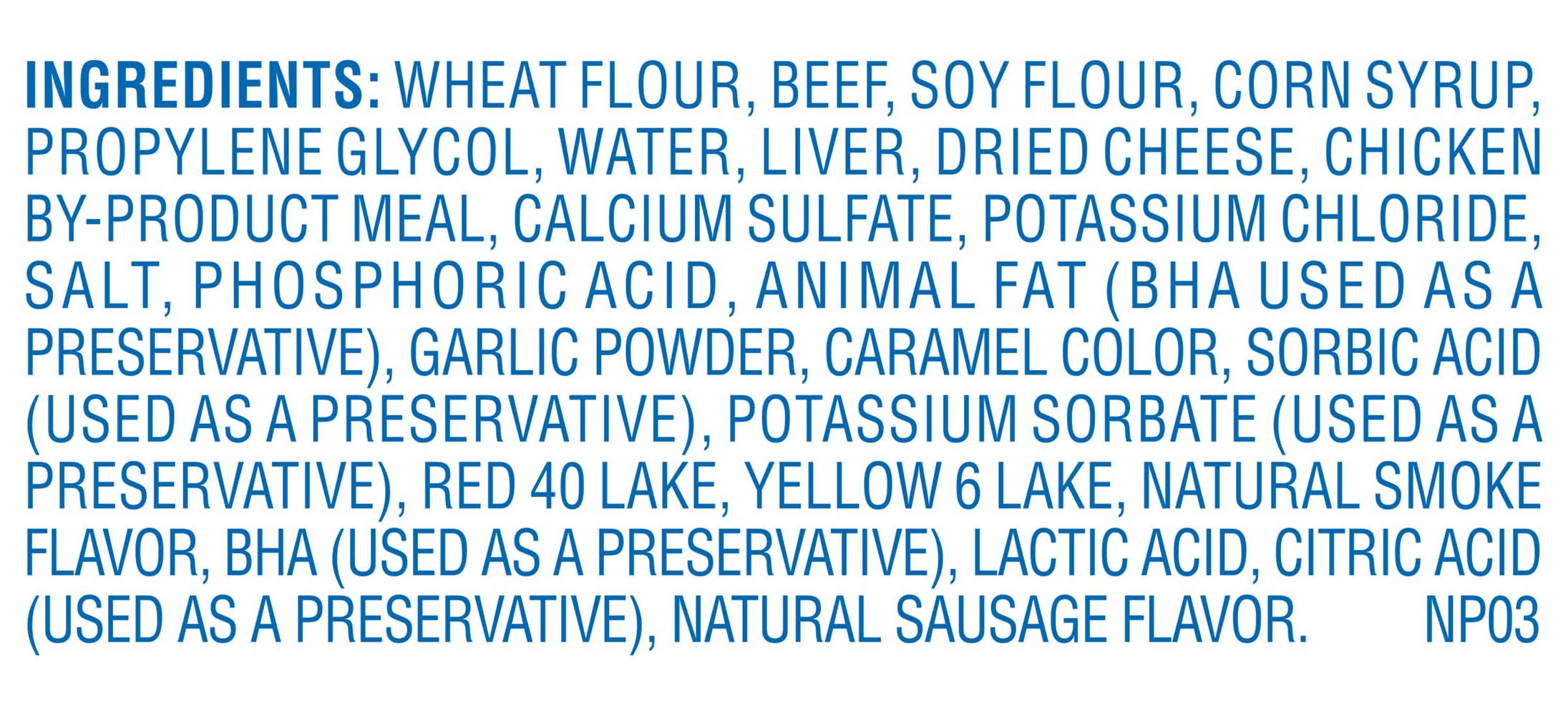 Ingredients: Wheat Flour, Beef, Soy Flour, Corn Syrup, Propylene Glycol, Water, Liver, Dried Cheese, Chicken By-product Meal, Calcium Sulfate, Potassium Chloride, Salt, Phosphoric Acid, Animal Fat (bha Used As A Preservative), Garlic Powder, Caramel Color, Sorbic Acid (used As A Preservative), Potassium Sorbate (used As A Preservative), Red 40 Lake, Yellow 6 Lake, Natural Smoke Flavor, Bha (used As A Preservative), Lactic Acid, Citric Acid (used As A Preservative), Natural Sausage Flavor. Contains: Wheat, Corn, Soybeans