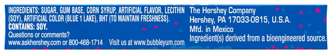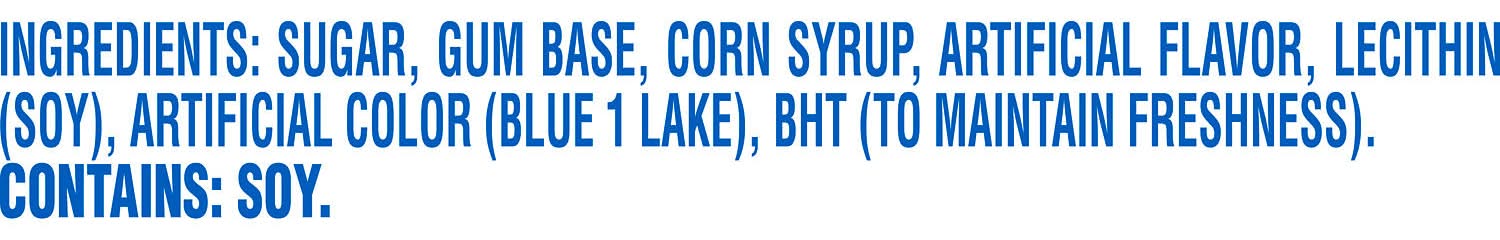 Ingredients: SUGAR, GUM BASE, CORN SYRUP, ARTIFICIAL FLAVOR, LECITHIN (SOY), ARTIFICIAL COLOR (BLUE 1 LAKE), BHT (TO MAINTAIN FRESHNESS), . Contains: Contains: Soy