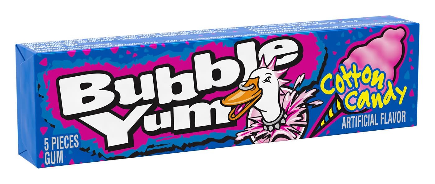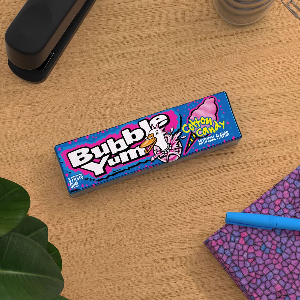 BUBBLE YUM cotton candy flavored bubble gum has a soft texture and fun flavor you will love to chew on and share with friends. This pack contains 5 individually wrapped pieces of gum that you can hand out at birthday parties, sporting events and any time that deserves a chewy and flavorful treat. Try blowing the biggest bubble to keep the kiddos entertained or keep packs stored in your work desk drawer for a sweet and chewy midday treat with a classic bubble gum flavor. This pack of BUBBLE YUM cotton candy flavored bubble gum can travel with you anywhere, whether you're on a road trip, driving to the grocery store or out with your best friends. Stack individual packs of gum in your candy drawer or gift them to your favorite people during the holidays. Create sweet Valentine's Day gift bags, Easter candy baskets, festive Christmas stockings and Halloween candy displays for a night full of chewy and delicious fun. Or, celebrate ordinary moments throughout the year with the sweet and chewy flavor of cotton candy. Just don't forget to save a few pieces of BUBBLE YUM cotton candy flavored bubble gum for yourself during all of that sharing! Flavor: Cotton candy