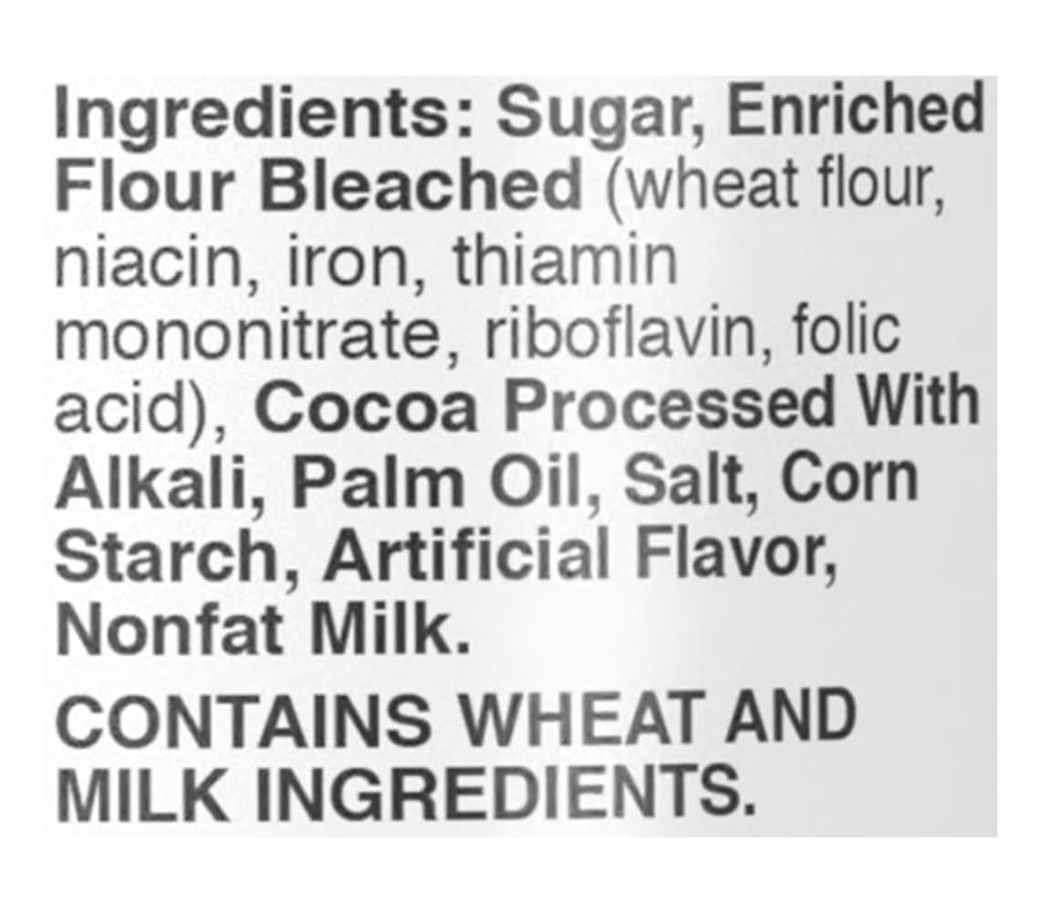Ingredients: Sugar, Enriched Flour Bleached (Wheat Flour, Niacin, Iron, Thiamin Mononitrate, Riboflavin, Folic Acid), Cocoa Processed with Alkali, Palm Oil, Salt, Corn Starch, Artificial Flavor, Nonfat Milk Contains: Wheat, Milk