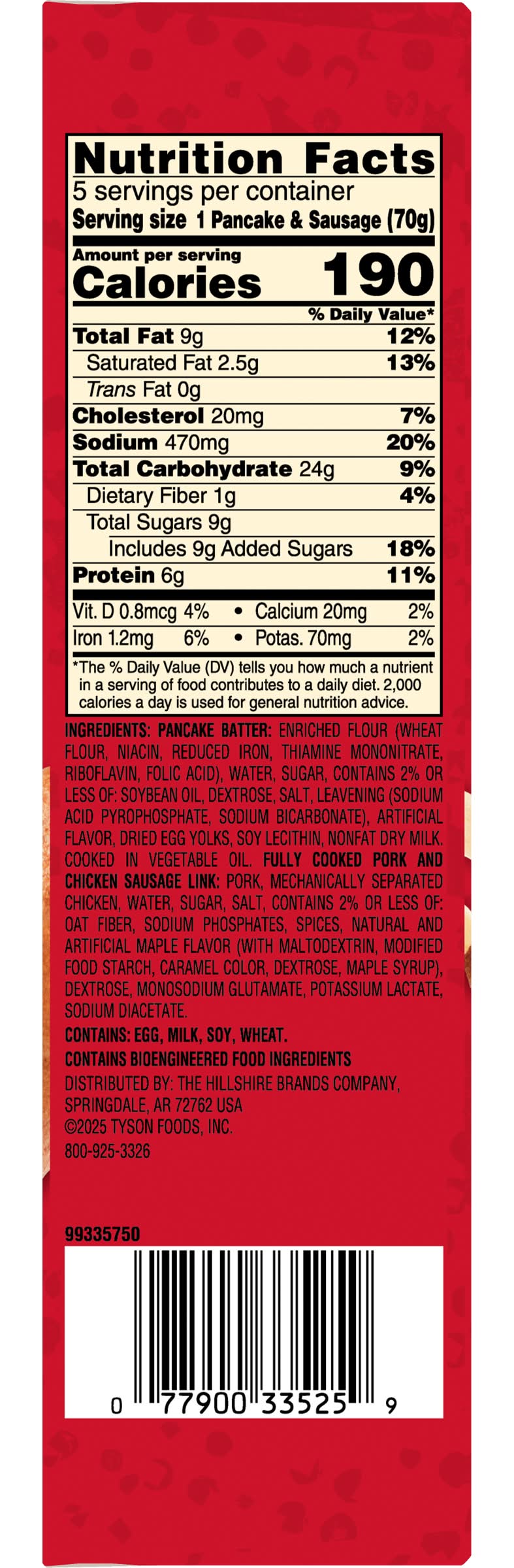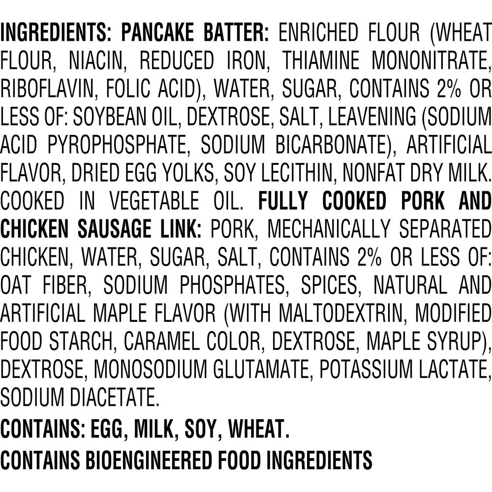 Ingredients: Pancake Batter: Enriched Flour (Wheat Flour, Niacin, Reduced Iron, Thiamine Mononitrate, Riboflavin, Folic Acid), Water, Sugar, Contains 2% Or Less Of: Soybean Oil, Dextrose, Salt, Leavening (Sodium Acid Pyrophosphate, Sodium Bicarbonate), Artificial Flavor, Dried Egg Yolks, Soy Lecithin, Nonfat Dry Milk. Cooked In Vegetable Oil. Fully Cooked Pork And Chicken Sausage Link: Pork, Mechanically Separated Chicken, Water, Sugar, Salt, Contains 2% Or Less Of: Oat Fiber, Sodium Phosphates, Spices, Natural And Artificial Maple Flavor (With Maltodextrin, Modified Food Starch, Caramel Color, Dextrose, Maple Syrup), Dextrose, Monosodium Glutamate, Potassium Lactate, Sodium Diacetate. Contains: Eggs, Milk, Soy, Wheat Additives: Genetically Modified Ingredients
