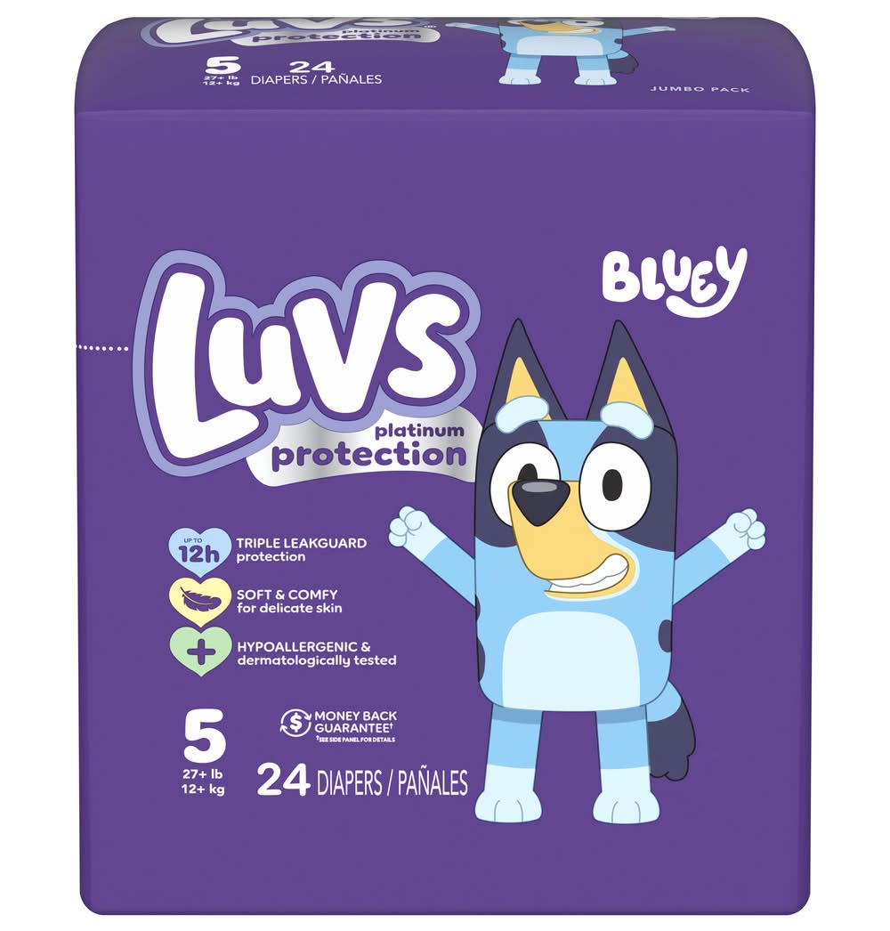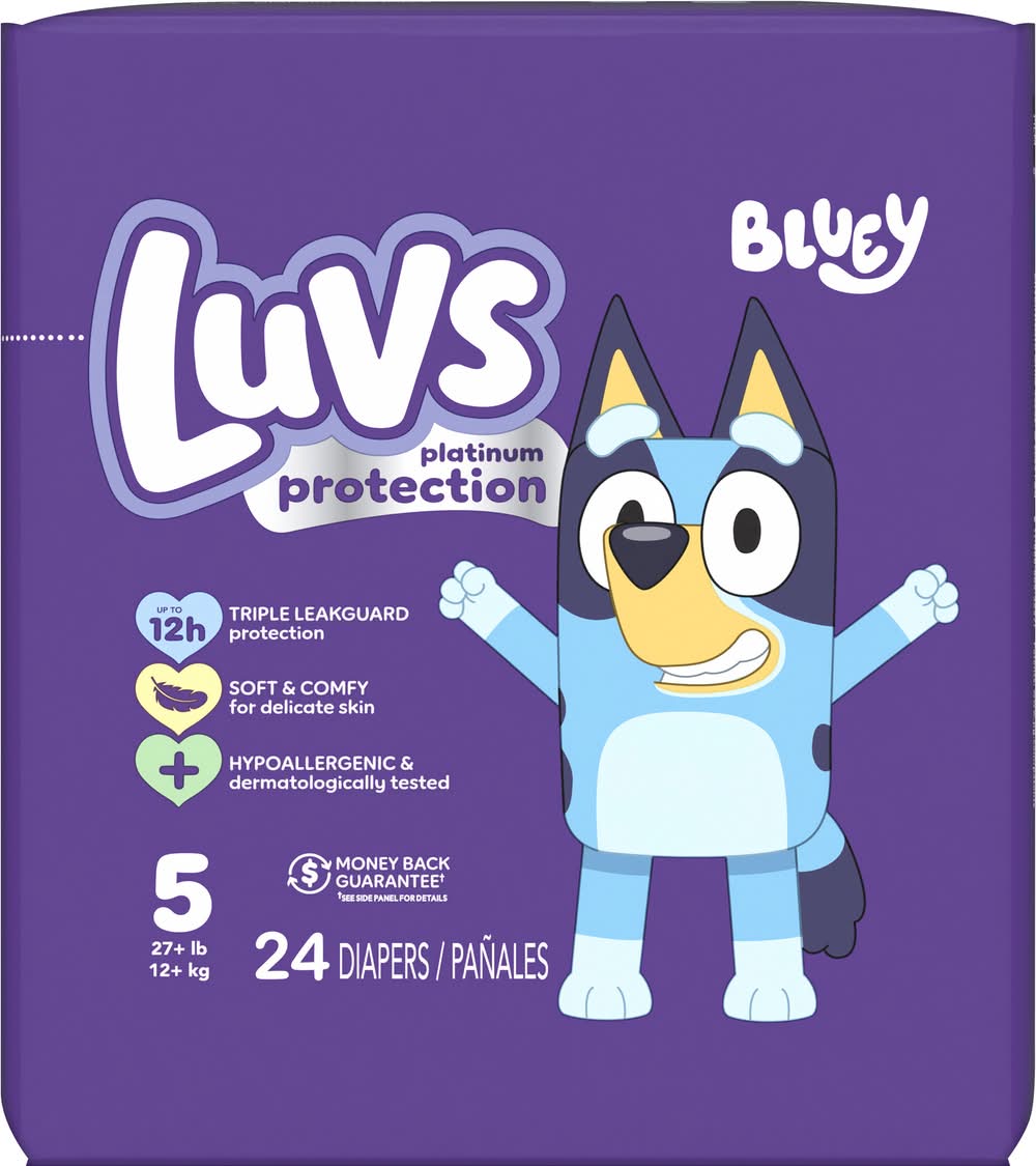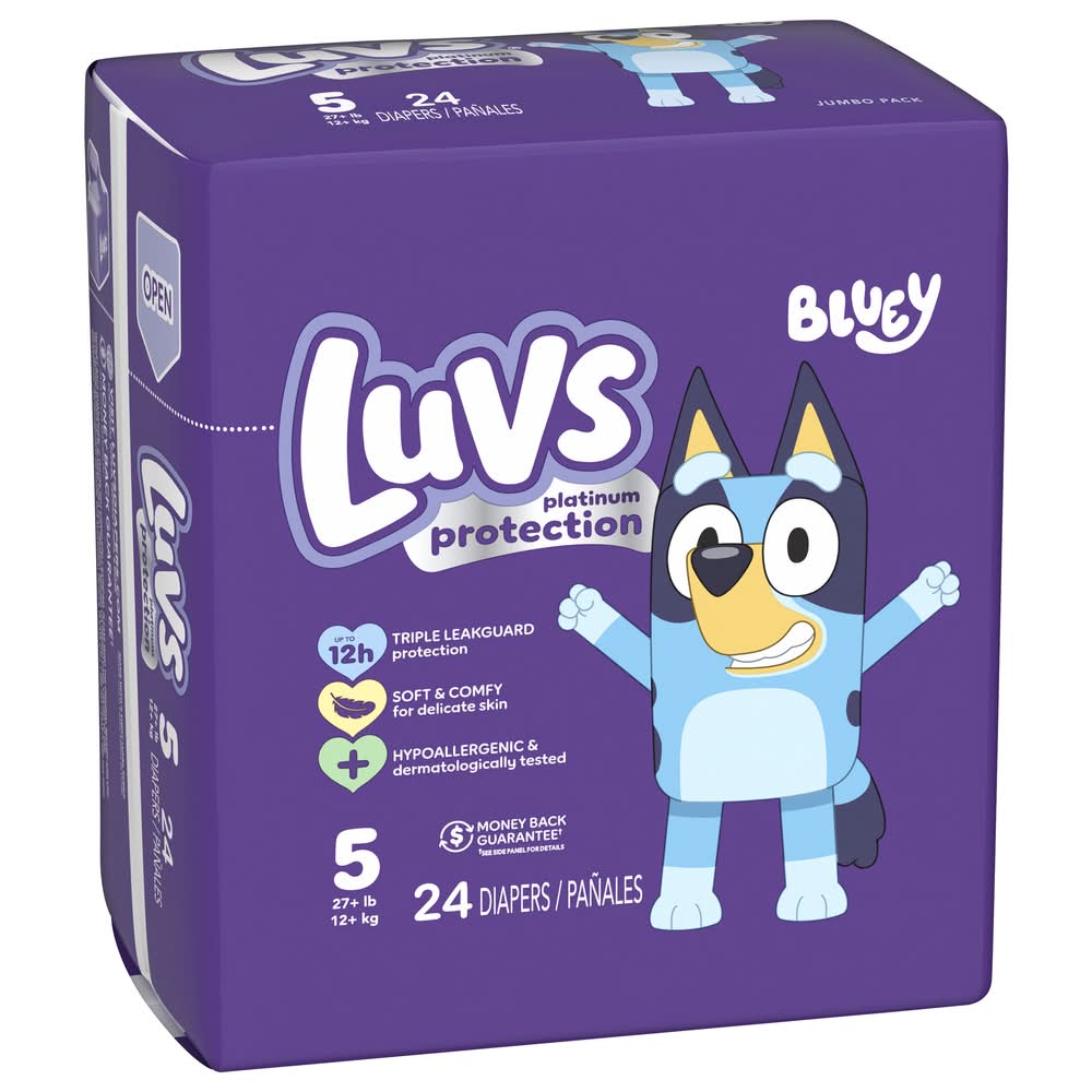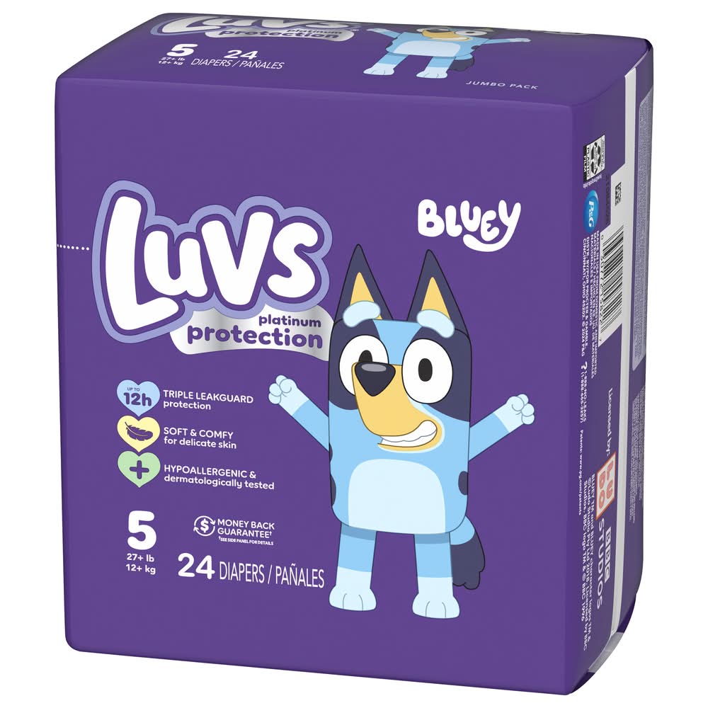 Introducing Luvs Platinum Protection diapers featuring Bluey! Luvs disposable diapers have up to 12-hours of Triple Leakguard Protection, but our leak protection doesn't stop there, the secure cuffs and stretchy sides help keep leaks locked in where they happen the most. Feel the softness and bring a new level of comfort for baby's delicate skin. Parenting can be stressful. Rest assured with worry-free Luvs Diapers and give your baby the gentle comfort he/she needs with the name brand protection that parents trust. With Luvs Platinum Protection diapers you know when they go, thanks to a wetness indicator that turns blue on contact with wetness. Plus, meet our best friend, Bluey. These adorably fun patterns give our diapers an added layer of cuteness to match your baby. Here are the highlights: Four levels of protection: Triple Leakguards, wetness indicator, secure and stretchy sides, comfy leak barrier cuffsMax softness: Soft and comfy for your baby's delicate skin It's not a mystery that babies are pretty delicate, so these diapers are dermatologically tested, hypoallergenic, and free of parabens and latex.*. Luvs Platinum Protection Baby Diapers are available in sizes N-8. Size newborn (<10 lb), size 1 (8-14lb), size 2 (12-18 lb), size 3 (16-28 lb), size 4 (22-37 lb), size 5 (27+ lb), size 6 (35+ lb), and size 7 (41+ lb), size 8 (46+ lb).*Natural rubber. Size: 5