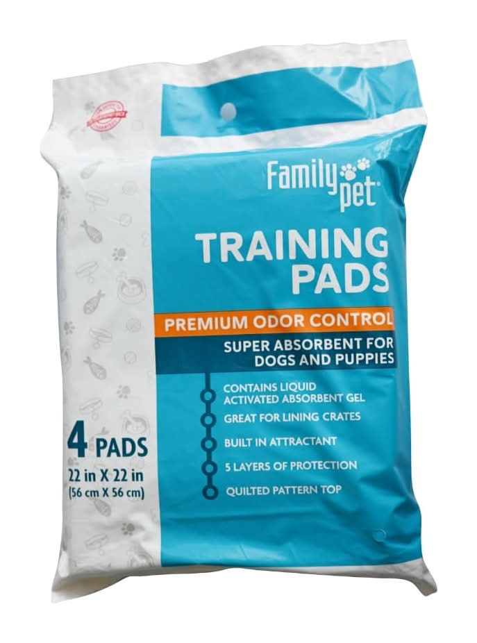 Perfect potty pads for pups provide peace and practicality! Family Pet(R) Odor Control Puppy Training Pads are a great way to house train your pets and protect your floors. Simply entice your pooch to approach the pad (the built-in attractant helps here), engage with it, and finally encourage them to use it. The super-absorbent core turns liquid to gel upon contact and the leak-proof plastic lining keeps your floors safe from any damage. For easy clean-up, these pads are easily replaceable and disposable. Excellent for new puppies, senior dogs, dogs with limited access to the outdoors, sick dogs, rainy or stormy days, car rides... you're covered in all situations! Use these 22x22-in. pads at home, in shelters, in crates, or in kennels. Each pack includes 4 pads. For those moments when nature calls at the wrong time, use Family Pet(R) Odor Control Puppy Training Pads! Size: 22 x 22 in