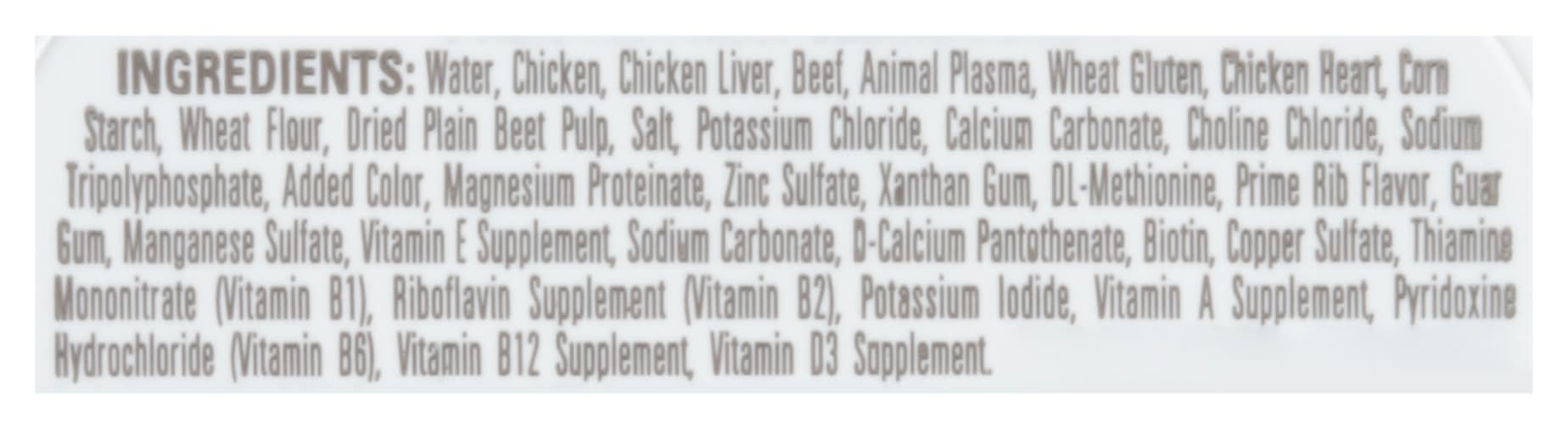 Ingredients: Water, Chicken, Chicken Liver, Beef, Animal Plasma, Wheat Gluten, Chicken Heart, Corn Starch, Wheat Flour, Dried Plain Beet Pulp, Salt, Potassium Chloride, Calcium Carbonate, Choline Chloride, Sodium Tripolyphosphate, Added Color, Magnesium Proteinate, Zinc Sulfate, Xanthan Gum, DL-Methionine, Prime Rib Flavor, Guar Gum, Manganese Sulfate, Vitamin E Supplement, Sodium Carbonate, D-Calcium Pantothenate, Biotin, Copper Sulfate, Thiamine Mononitrate (Vitamin B1), Riboflavin Supplement (Vitamin B2), Potassium Iodide, Vitamin A Supplement, Pyridoxine Hydrochloride (Vitamin B6), Vitaminb12 Supplement, Vitamin D3 Supplement Contains: Wheat, Gluten
