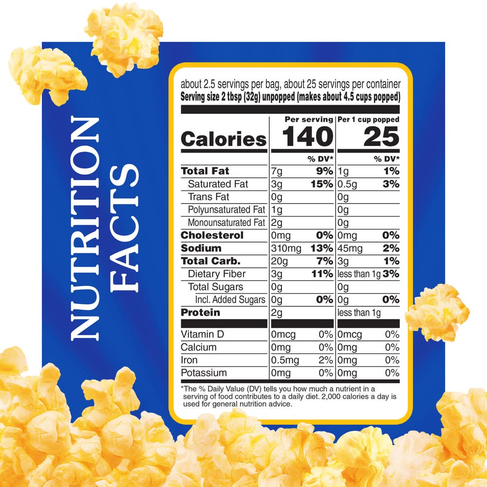 Ingredients: Popping Corn, Palm Oil, Salt, Less than 2% of: Natural Flavor, Color Added (Annatto), TBHQ and Citric Acid (for Freshness). Contains: Corn