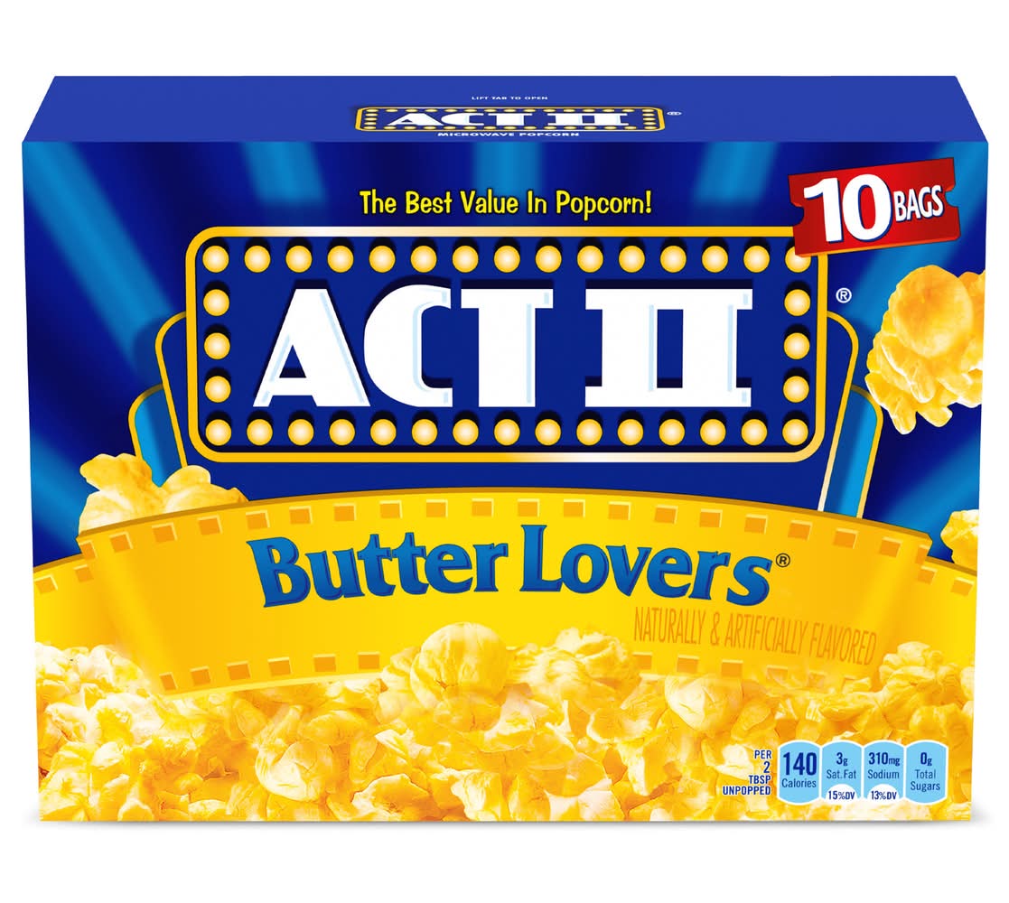 Experience delicious buttery goodness in every fluffy kernel with ACT II Butter Lovers Microwave Popcorn. ACT II is quick and convenient microwave popcorn that's gluten free and made with 100% whole grain popcorn kernels. Try this buttery, salty snack for game nights, movie nights, birthday parties, afternoon pick-me-ups or anytime you want to indulge in salty yumminess. From Butter Lovers and homestyle popcorn to kettle corn and beyond, there is a flavor to satisfy every single craving. Snack Like You Mean It with ACT II Butter Popcorn: the best value in popcorn. • Flavor: Butter lovers • Pack size: 10