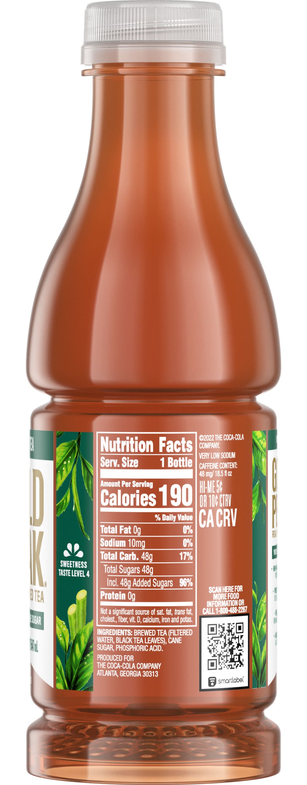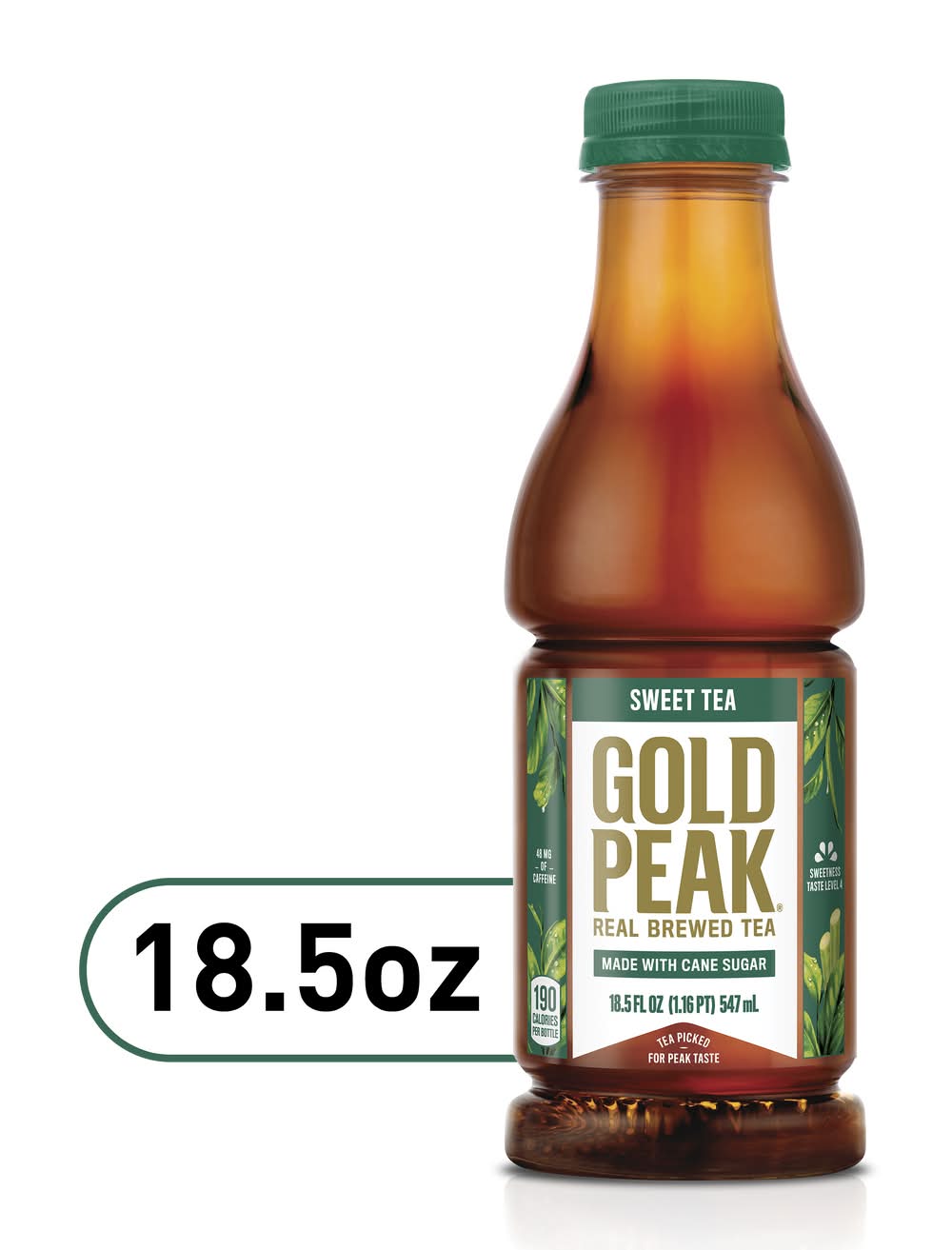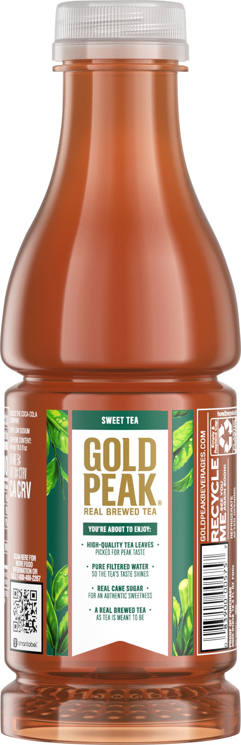 Gold Peak Teas are brewed with high-quality tea leaves from the top of the tea plant, which, in our opinion, is the best part. Combined with our golden brewing process, you've got a real-brewed bottled iced tea that's as good as gold. Every sip is brewed with care - delivering good, quality sweet tea that does all the little things right. More importantly, it's real, just like you.It's the kind of drink that makes any moment golden. Thoughtfully brewed to complement your favorite meals, it's the perfect pairing for every dish - whether it's a weeknight dinner that brings everyone to the table or a block party shared with friends. From Sunday brunch to weekend picnics and bonfires under the stars, Gold Peak Iced Tea is meant to be shared with the people who make life taste better.Gold Peak Sweet Tea brings the comforting taste of real-brewed tea, made from high-quality tea leaves picked for peak taste. Sweetened with real cane sugar, this tea tastes so good you'll think it was homemade. Each bottle provides a bold splash of sweet black tea, bringing the taste of summer no matter the season. • The Coca-cola Company, Atlanta,GA,30313 • Packaging: Reusable