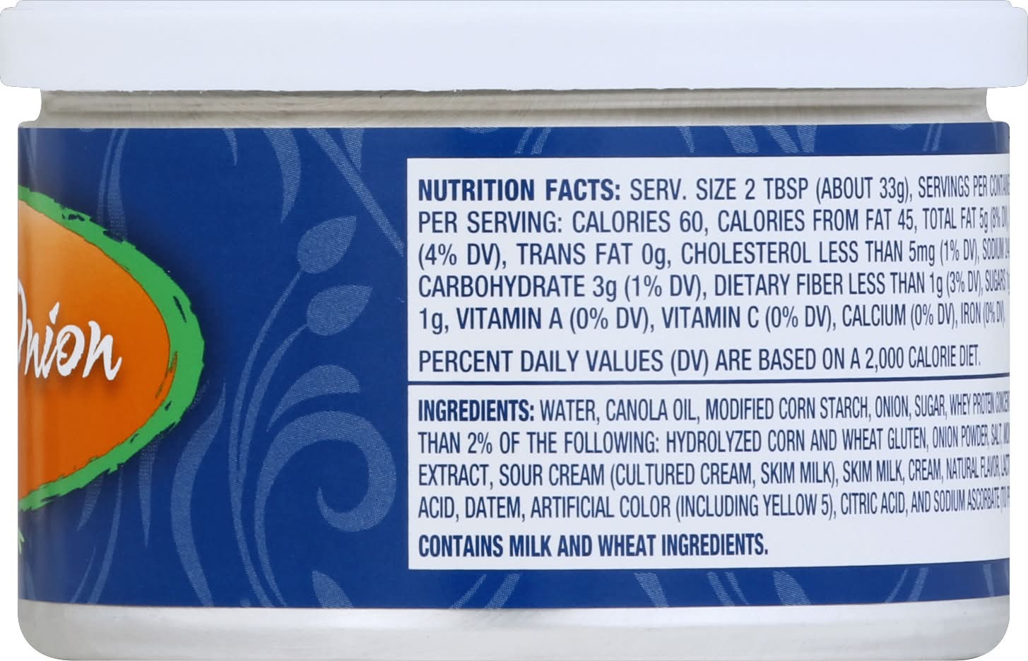 Ingredients: Water, Canola Oil, Modified Corn Starch, Onion, Sugar, Whey Protein Concentrate, Butter Oil, and Less than 2% of the Following: Hydrolyzed Corn and Wheat Gluten, Onion Powder, Salt, Monosodium Glutamate, Yeast Extract, Sour Cream (Cultured Cream, Skim Milk), Skim Milk, Cream, Natural Flavor, Lactic Acid, Xanthan Gum, Acetic Acid, DATEM, Artificial Color (Including Yellow 5), Citric Acid, and Sodium Ascorbate (to Preserve Freshness) Contains: Milk, Wheat