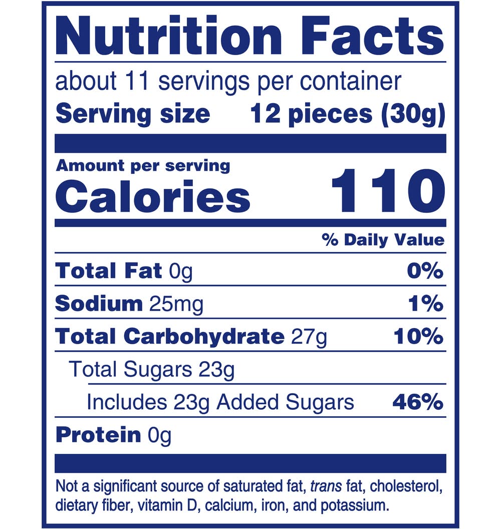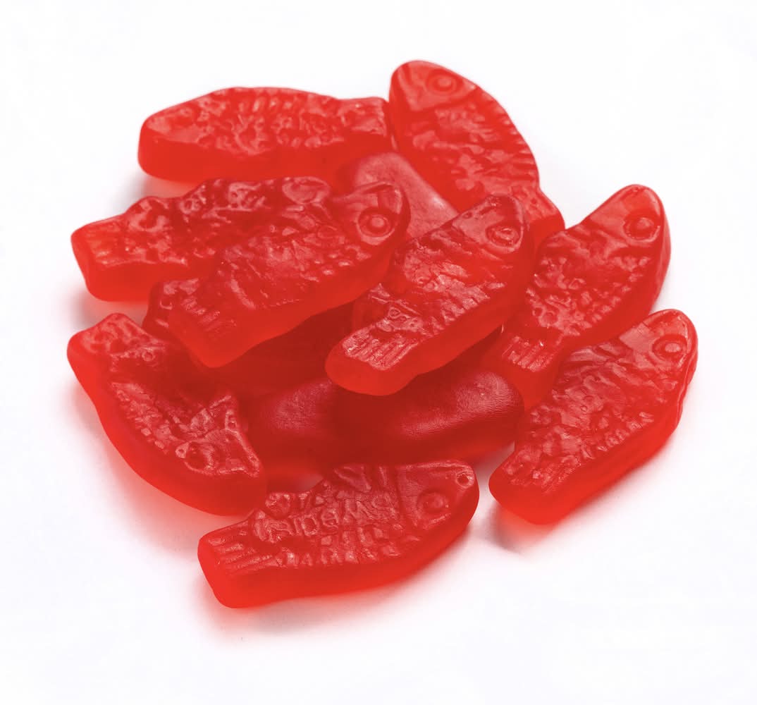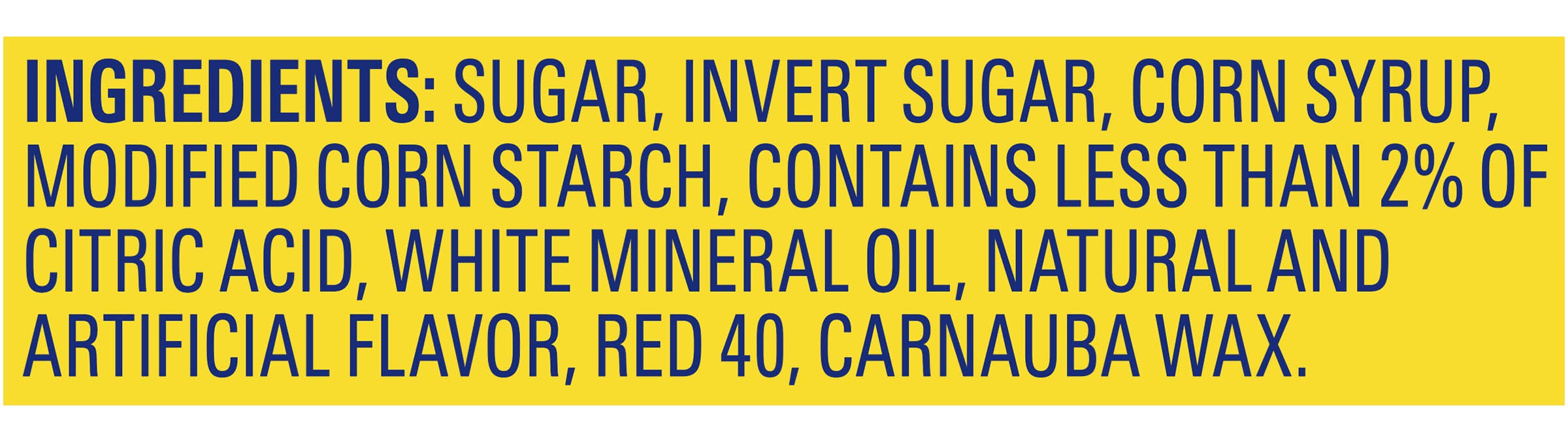 Ingredients: INGREDIENTS: SUGAR, INVERT SUGAR, CORN SYRUP, MODIFIED CORN STARCH, CONTAINS LESS THAN 2% OF CITRIC ACID, WHITE MINERAL OIL, NATURAL AND ARTIFICIAL FLAVOR, RED 40, CARNAUBA WAX.