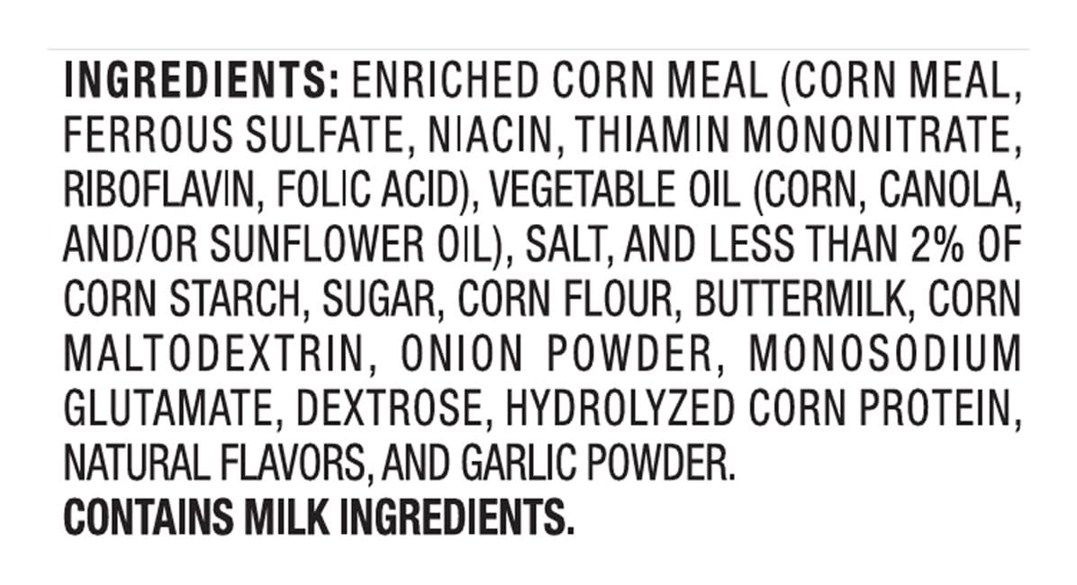 Ingredients: Enriched Corn Meal (Corn Meal, Ferrous Sulfate, Niacin, Thiamin Mononitrate, Riboflavin, Folic Acid), Vegetable Oil (Corn, Canola, and/or Sunflower Oil), Salt, and Less than 2% of Corn Starch, Sugar, Corn Flour, Buttermilk, Corn Maltodextrin, Onion Powder, Monosodium Glutamate, Dextrose, Hydrolyzed Corn Protein, Natural Flavors, and Garlic Powder Contains: Corn, Milk