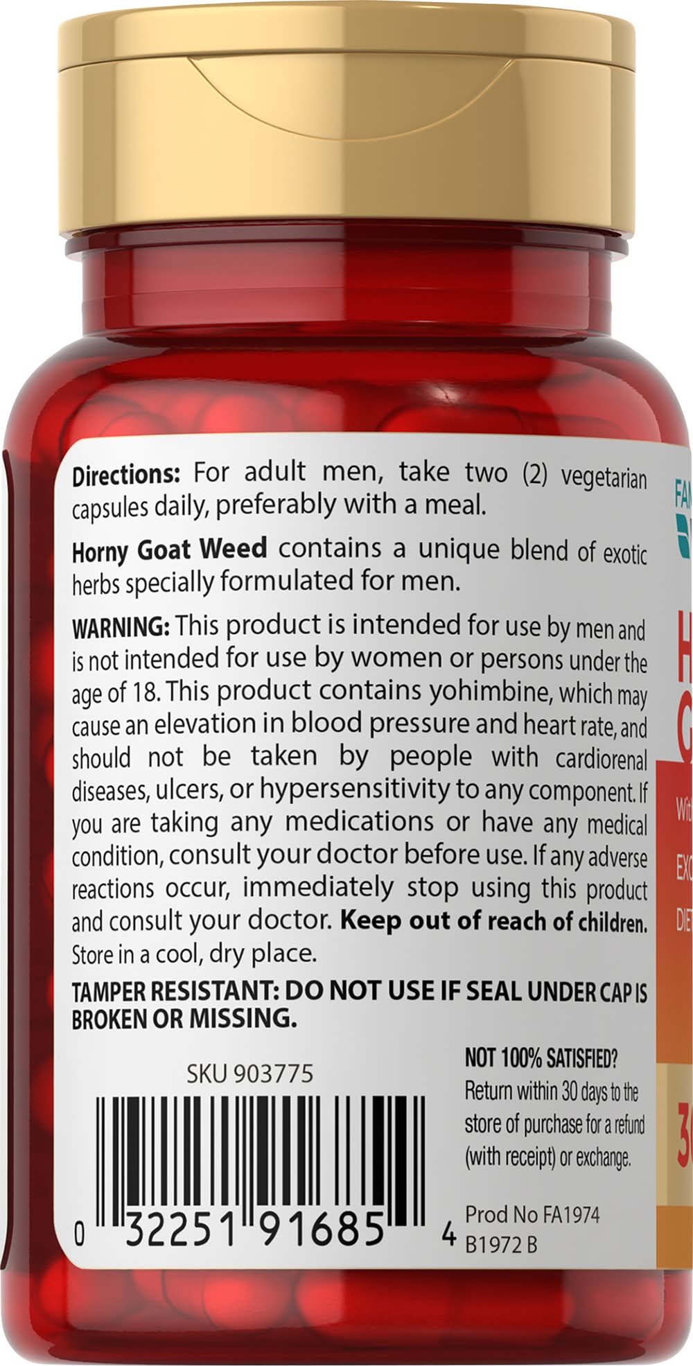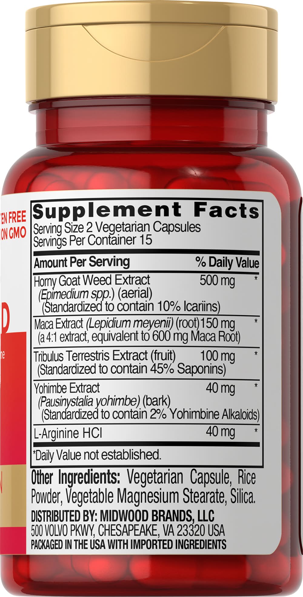 Horny Goat Weed:Horny Goat Weed is an herb that has been used for centuries in traditional wellness practices throughout Asia, Europe, and Africa. Horny Goat Weed contains an abundance of naturally occurring compounds, making it a desired herbal supplement especially for men. Our Formula:Our vegetarian capsules provide herbal support for men from a blend of herbs and nutrients. Each serving delivers 500 mg of Horny Goat Weed Extract, along with 150 mg of Maca Extract, 100 mg of Tribulus Terrestris Extract, 40 mg of Yohimbe Extract, and 40 mg of the essential amino acid L-Arginine HCl for additional support. Gluten free and non-GMO. male