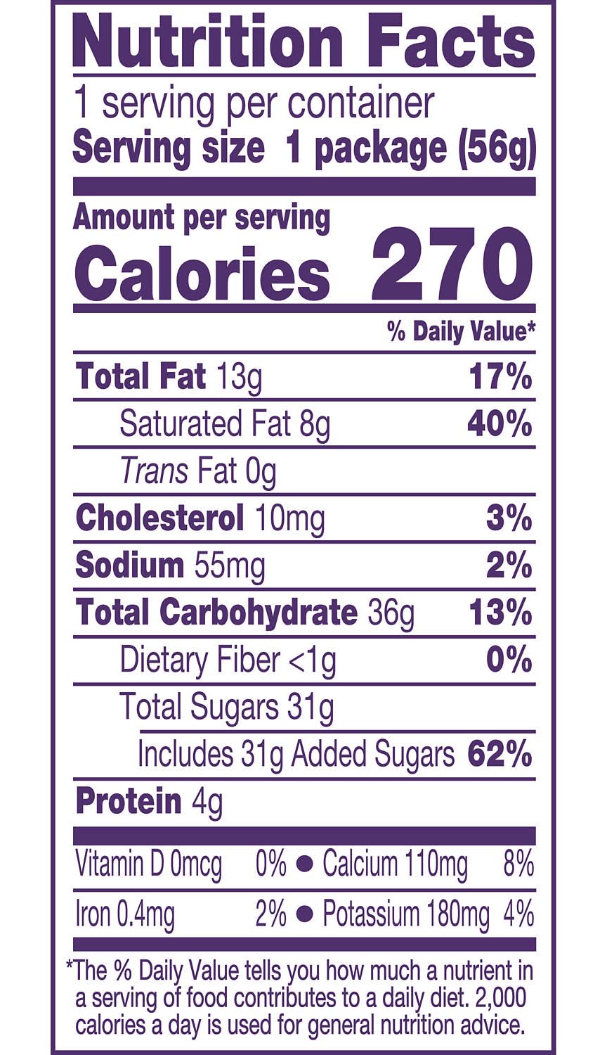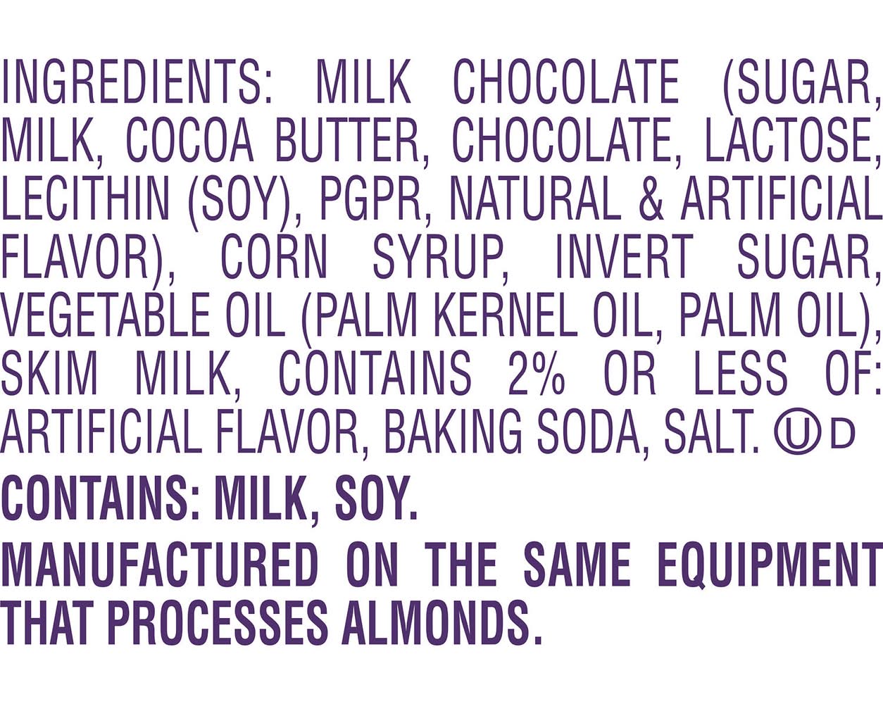 Ingredients: MILK CHOCOLATE (SUGAR, MILK, COCOA BUTTER, CHOCOLATE, LACTOSE, LECITHIN (SOY), PGPR, NATURAL ARTIFICIAL FLAVOR), CORN SYRUP, INVERT SUGAR, VEGETABLE OIL (PALM KERNEL OIL, PALM OIL), SKIM MILK, CONTAINS 2% OR LESS OF: ARTIFICIAL FLAVOR, BAKING SODA, SALT. Contains: Contains: Soy, Milk