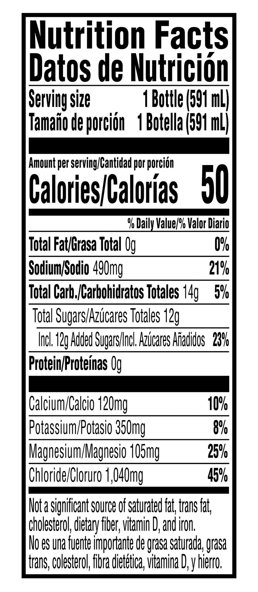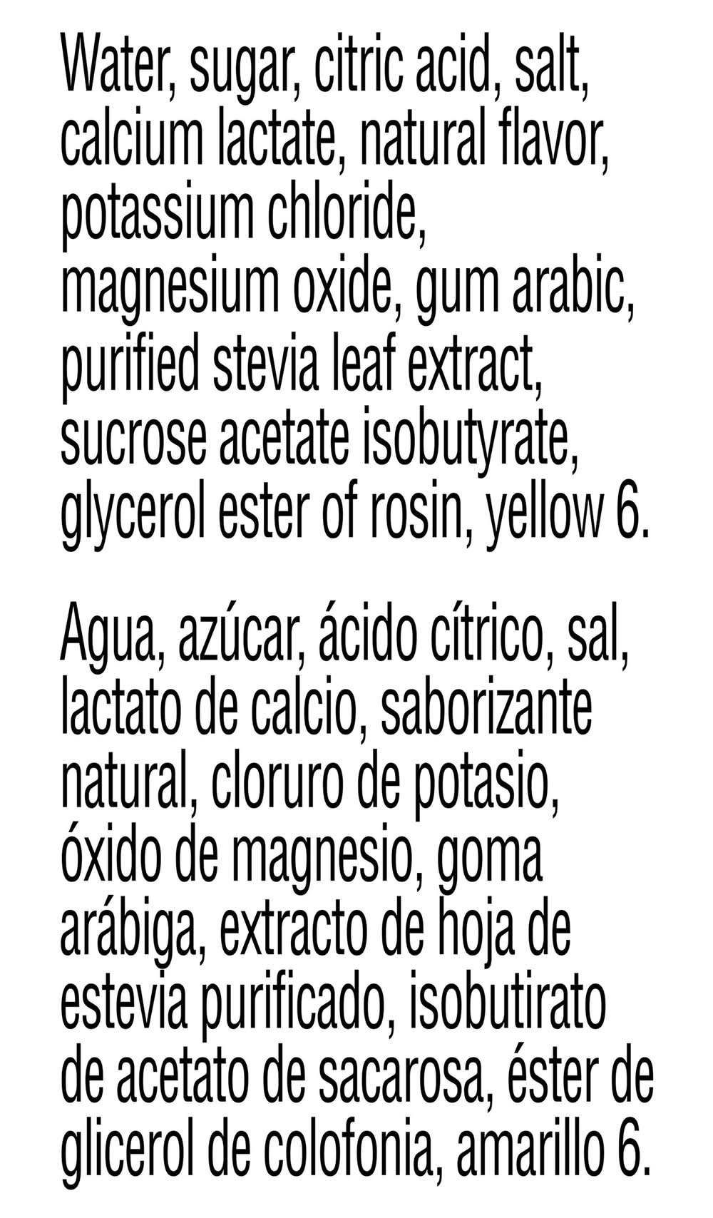 Ingredients: Water, Sugar, Citric Acid, Salt, Calcium Lactate, Natural Flavor, Potassium Chloride, Magnesium Oxide, Gum Arabic, Purified Stevia Leaf Extract, Sucrose Acetate Isobutyrate, Glycerol Ester of Rosin, Yellow 6