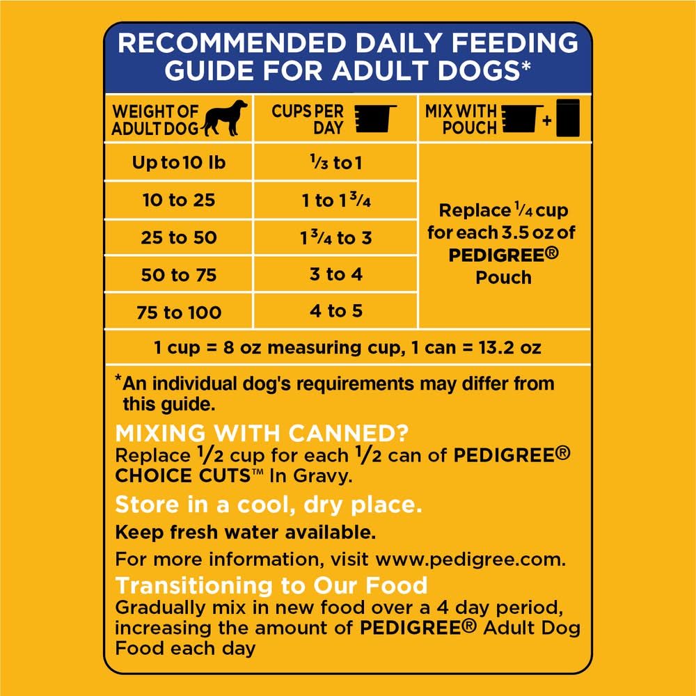 Directions for use: Directions: Store in a cool, dry place. Recommended daily feeding guide for adult dogs (An individual dog's requirements may differ from this guide): (Weight of Adult Dog): Up to 10 lb. Cups per day: 1/2 to 1. Mix with pouch + replace 1/4 cup for each 3.5 oz of Pedigree pouch. (Weight of Adult Dog): 10 to 25. Cups per day: 1 to 1-3/4. Mix with pouch + replace 1/4 cup for each 3.5 oz of Pedigree pouch. (Weight of Adult Dog): 25 to 50; Cups per day: 1-3/4 to 3. Mix with pouch + replace 1/4 cup for each 3.5 oz of Pedigree pouch. (Weight of Adult Dog): 50 to 75; Cups per day: 3 to 4. Mix with pouch + replace 1/4 cup for each 3.5 oz of Pedigree pouch. (Weight of Adult Dog): 75 to 150. Cups per day: 4 to 5. Mix with pouch + replace 1/4 cup for each 3.5 oz of Pedigree pouch. 1 cup = 8 oz. measuring cup, 1 can = 13.2 oz. Mixing with canned? Replace 1/2 cup for each 1/2 can of Pedigree Choice Cuts in Gravy. Keep fresh water available. Transition to our food. Gradually mix in new food over a 4 day period, increasing the amount of Pedigree Adult Dog Food each day. Storage recommendation: Store in a cool, dry place.