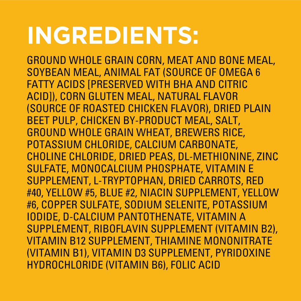 Ingredients: INGREDIENTS: Ground Whole Grain Corn, Meat and Bone Meal, Soybean Meal, Animal Fat (Source of Omega 6 fatty acids [preserved with BHA and citric acid]), Corn Gluten Meal, Natural Flavor (Source of Roasted Chicken Flavor), Dried Plain Beet Pulp, Chicken By-Product Meal, Salt, Ground Whole Grain Wheat, Brewers Rice, Potassium Chloride, Calcium Carbonate, Choline Chloride, Dried Peas, DL-Methionine, Zinc Sulfate, Monocalcium Phosphate, Vitamin E Supplement, L-Tryptophan, Dried Carrots, Red #40, Yellow #5, Blue #2, Niacin Supplement, Yellow #6, Copper Sulfate, Sodium Selenite, Potassium Iodide, D-Calcium Pantothenate, Vitamin A Supplement, Riboflavin Supplement (Vitamin B2), Vitamin B12 Supplement, Thiamine Mononitrate (Vitamin B1), Vitamin D3 Supplement, Pyridoxine Hydrochloride (Vitamin B6), Folic Acid