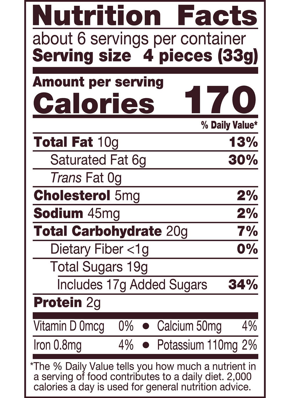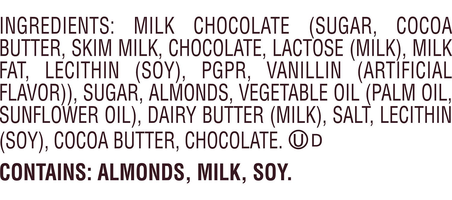 Ingredients: MILK CHOCOLATE, SUGAR, COCOA BUTTER, SKIM MILK, CHOCOLATE, LACTOSE (MILK), MILK FAT, LECITHIN (SOY), PGPR, VANILLIN (ARTIFICIAL FLAVOR), SUGAR, ALMONDS, VEGETABLE OIL (PALM OIL, SUNFLOWER OIL), DAIRY BUTTER (MILK), SALT, LECITHIN (SOY), COCOA BUTTER, CHOCOLATE. Contains: Contains: Almonds|Soy|Milk