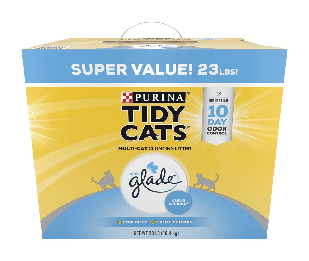 Bring the power of two trusted names in odor control to your home with Tidy Cats With Glade Clear Springs clumping litter. This Tidy Cats clumping litter neutralizes ammonia, urine and fecal odors, keeping each litter box smelling pleasant for 10 days when used as directed. Backed by the power of Glade, the clay cat litter defends against strong scents, leaving a fresh fragrance behind. Our low dust clumping cat litter forms strong, tight clumps, making litter box maintenance a simple task. Formulated for multiple cats, this Purina Tidy Cats scented cat litter stands up to regular use by all your feline family members, and the moisture-locking technology keeps them dry, comfortable and willing to use their boxes each day. Make it simple to check litter box cleaning off of your list with this powerful odor-control low dust cat litter, and get back to spending more quality time with your beloved cat companions. Packaging: Reusable