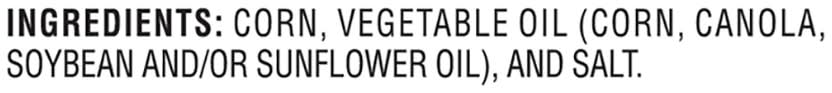 Ingredients: Corn, Vegetable Oil (Corn, Canola, Soybean and/or Sunflower Oil), and Salt Contains: Corn
