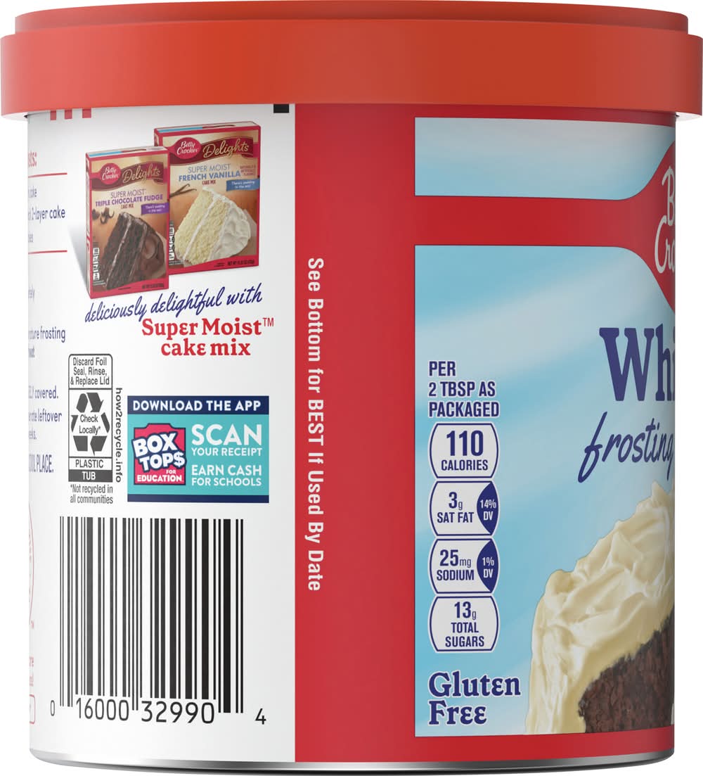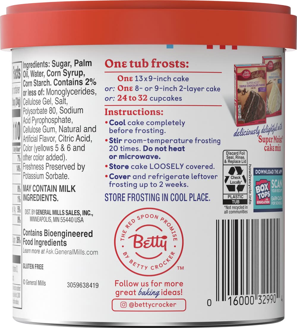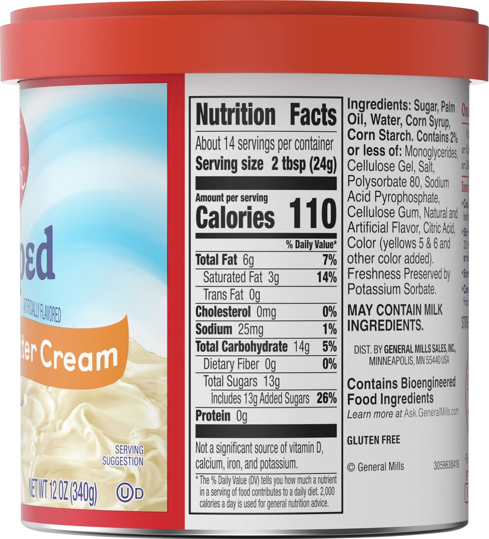 Indulge in the rich and velvety goodness of Betty Crocker Gluten-Free Whipped Butter Cream Frosting, available in a convenient 12 oz. container. This gluten-free frosting is a delectable addition to your baking repertoire, ensuring that everyone can enjoy a luscious and satisfying treat.Crafted with Betty Crocker's renowned expertise, this Whipped Butter Cream Frosting delivers a light and airy texture with a heavenly buttery flavor. Perfectly sweet and gluten-free, it's an ideal complement to cakes, cupcakes, cookies, or any baked creation that calls for a touch of decadence.The convenient and ready-to-use format of Betty Crocker Gluten-Free Whipped Butter Cream Frosting makes it a time-saving solution for busy bakers and those with gluten sensitivities. Simply spread or pipe the frosting onto your desserts for a delightful finishing touch.Elevate your gluten-free baking with the sumptuous taste of Betty Crocker Whipped Butter Cream Frosting. Let the creamy indulgence enhance your favorite treats, making every bite a celebration of flavor and inclusivity. • Flavor: Butter cream • General Mills Sales, Inc., Minneapolis, MN, 55440 • Packaging: Reusable
