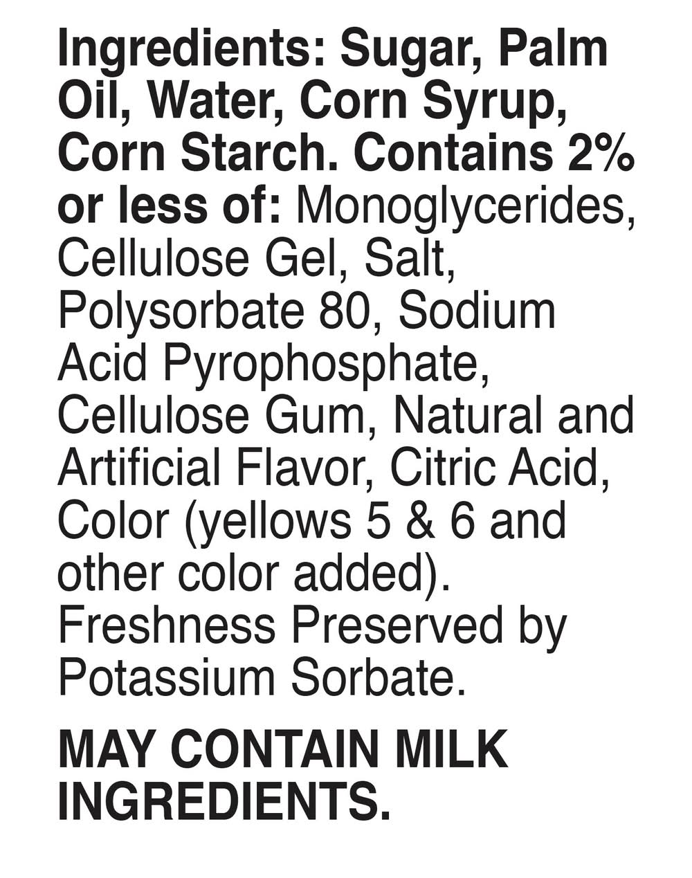 Ingredients: Sugar, Palm Oil, Water, Corn Syrup, Corn Starch. Contains 2% or Less of: Monoglycerides, Cellulose Gel, Salt, Polysorbate 80, Sodium Acid Pyrophosphate, Cellulose Gum, Natural and Artificial Flavor, Citric Acid, Color (Yellows 5 & 6 and Other Color Added). Freshness Preserved by Potassium Sorbate Contains: Corn, Milk