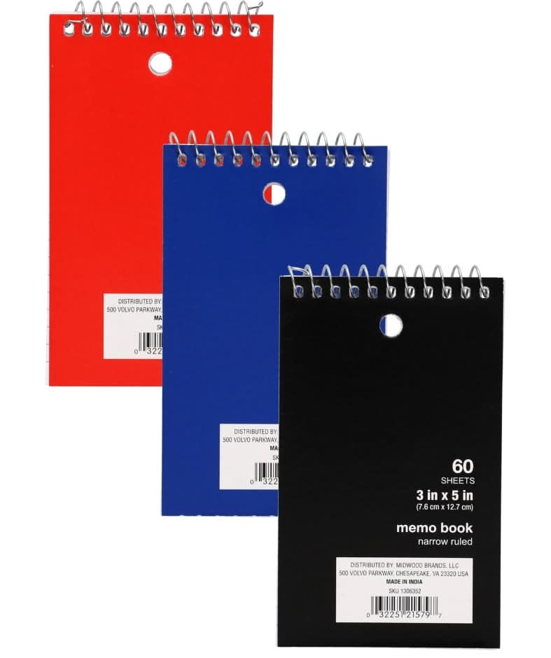 Practically perfect pocket pads! Pocket-sized note pads are a must-have for any occasion. These Mini Assorted Spiral-Bound Memo Pads come assorted among red, black, and blue colors and feature lined paper to keep everything organized. Their portable size means you can take them almost anywhere for note-taking or scheduling on-the-go. These notebooks make perfect party favors, stocking stuffers, teacher gifts, and back-to-school supplies! Color: Assorted