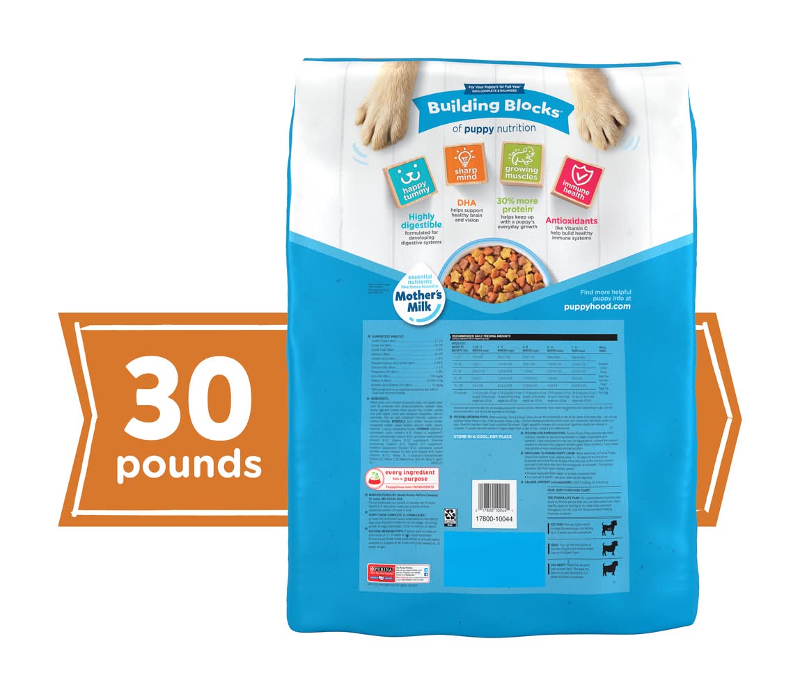 Provide the nutrition your puppy needs to get a great start in life with Purina Puppy Chow Complete With Real Chicken dry puppy food. This high protein dry puppy food contains 100 percent of the essential nutrients puppies require to grow big and strong, and the delicious taste gives him a reason to clean his bowl at every feeding. Tend to your growing pup's nutritional needs through the vital early stages of his development with this dry puppy dog food, and take comfort in knowing he's getting a highly digestible dog kibble formula he's sure to look forward to every day. Packed with 30 percent more protein than the leading adult dog food, this dog food kibble supports your puppy’s growing muscles so he can keep up with his adventurous canine pursuits. So dish up a serving of this Purina Puppy Chow dog food, and let him know you care about his health and happiness. Purina Puppy Chow Complete high protein puppy food provides the Building Blocks of puppy nutrition to help lay the foundation for a healthy, active life. The Healthy Start blend provides high-quality protein, including with real, American-raised chicken, DHA for brain and vision development, antioxidants like vitamin C and 100 percent of the essential nutrients for your puppy’s first year.