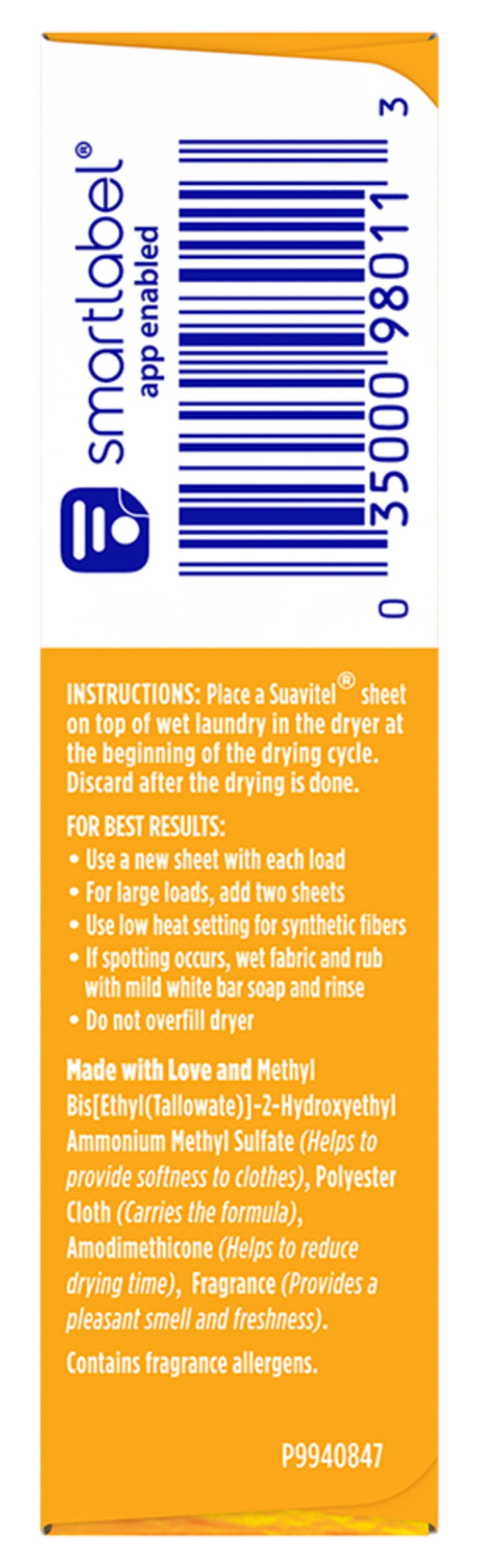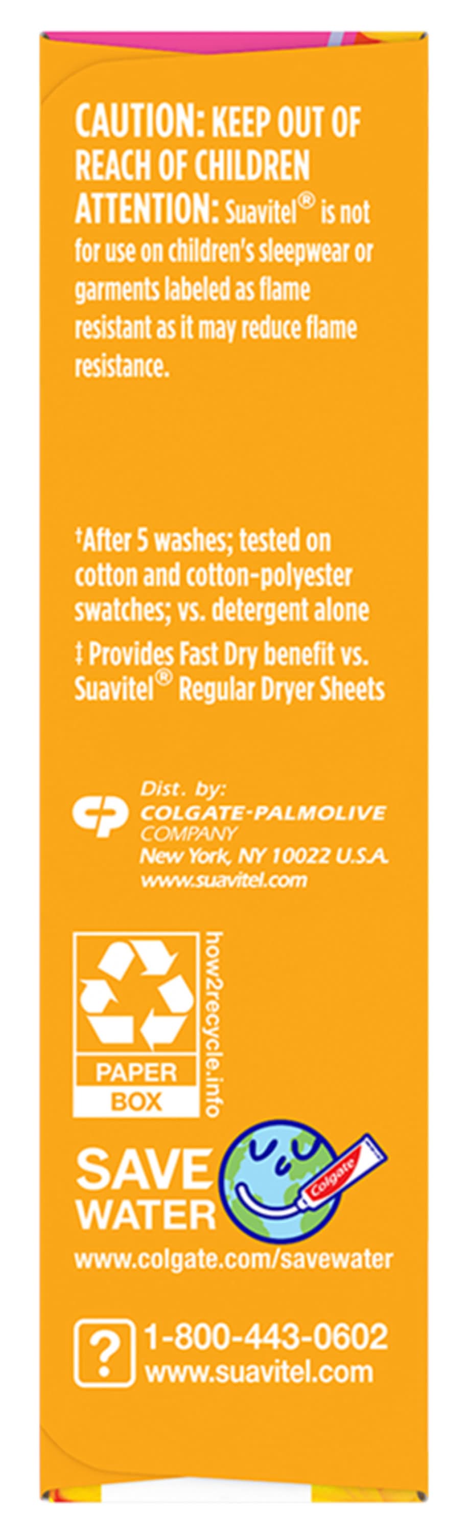 Instructions: place a suavitel sheet on top of wet laundry in the dryer at the beginning of the drying cycle. discard after the drying is done. for best results: use a new sheet with each load; for large loads, add two sheets; use low heat setting for synthetic fibers; if spotting occurs, wet fabric and rub with mild white bar soap and rinse; do not overfill dryer.caution: keep out of reach of children.,attention: suavitel is not for use on children's sleepwear or garments labeled as flame resistant as it may reduce flame resistance.