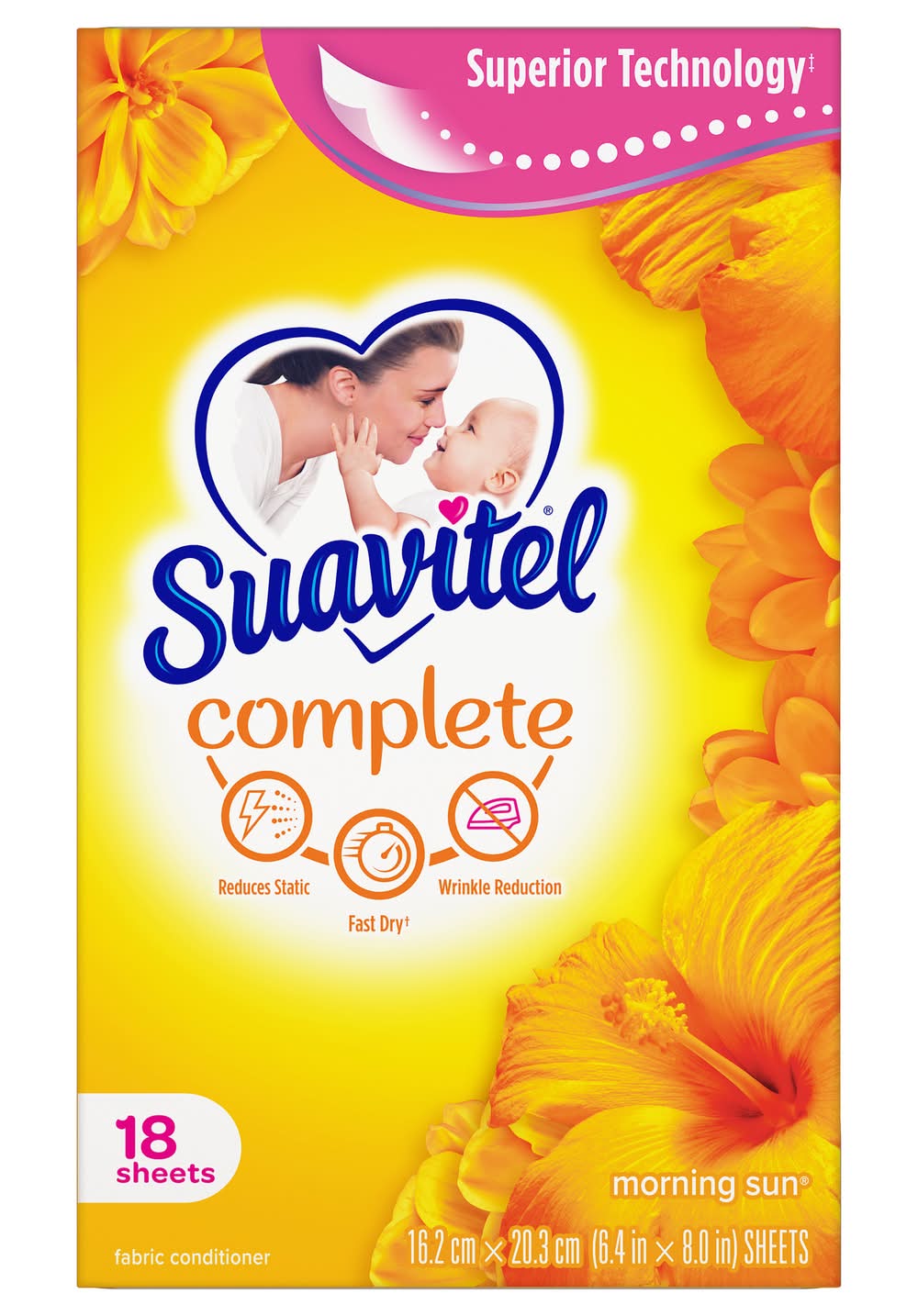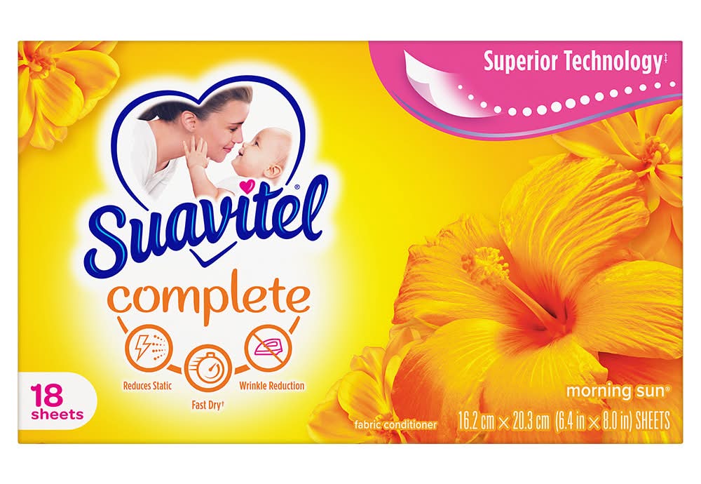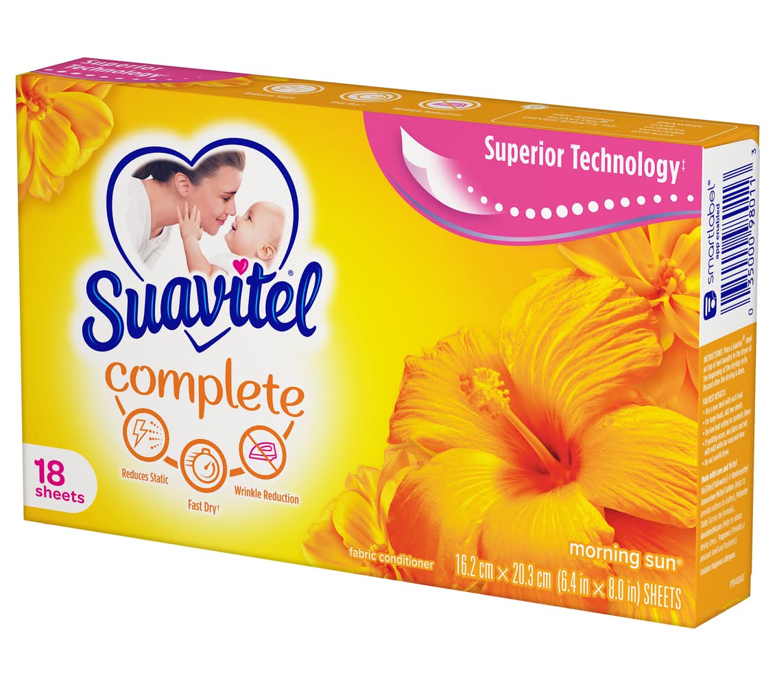 Suavitel Complete Morning Sun Fabric Softener Dryer Sheets have superior technology* that reduces static and wrinkles, and provides Fast Dry benefits** – all while delivering irresistible softening and freshness that you and your family will love. Try placing them in dresser drawers, closets, suitcases, gym bags – even in your car – to keep the feeling of warm summer sunshine with you wherever you go. And for even better laundry results, pair Suavitel Complete Morning Sun Dryer Sheets with Suavitel Complete Morning Sun Liquid Fabric Conditioner, which helps keep clothes looking newer longer**! *Provides Fast Dry benefit vs. Suavitel Regular Dryer Sheets **After 5 washes; tested on cotton and cotton polyester fabric; vs. detergent alone Colgate-Palmolive Company., New York,NY,10022,USA