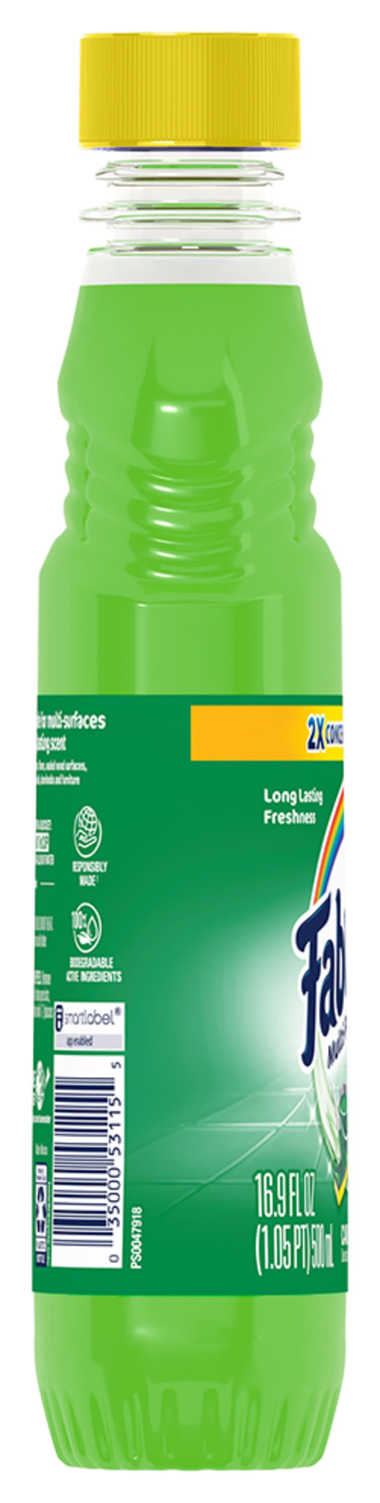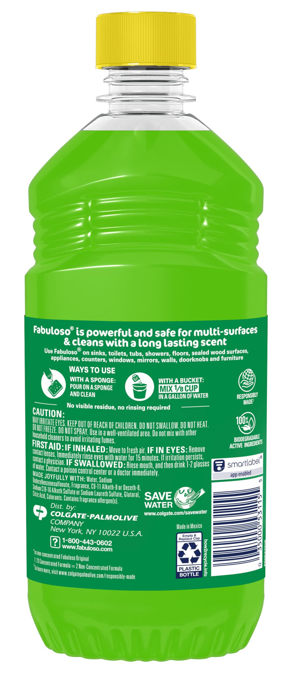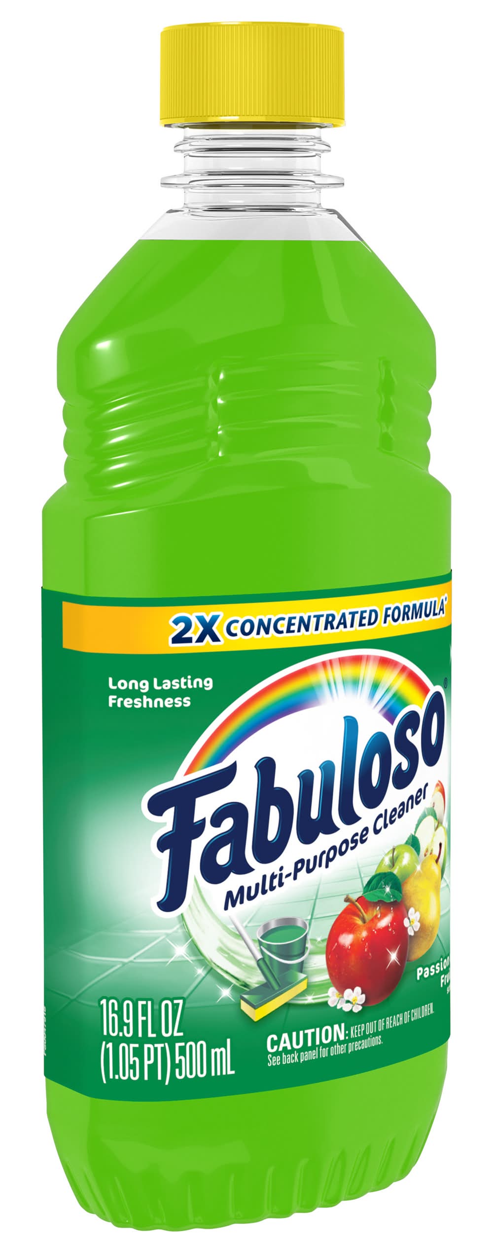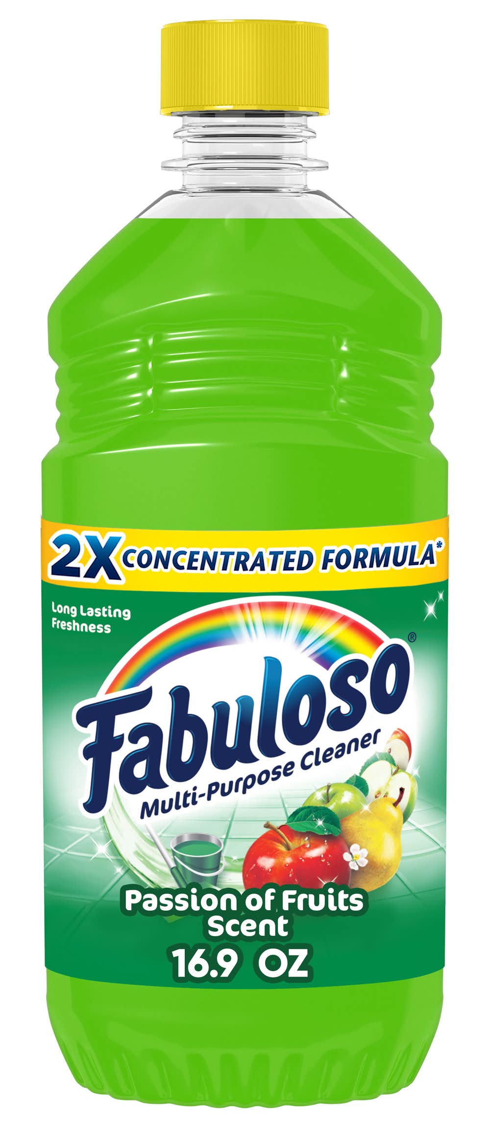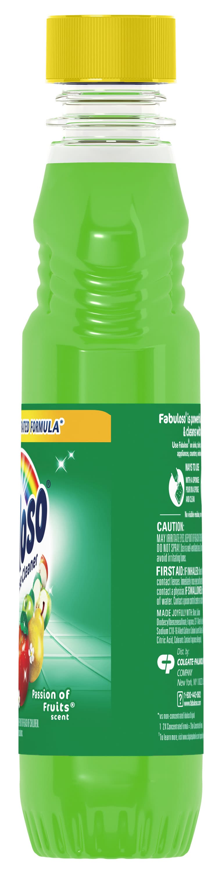 Fabuloso® Multi-Purpose Cleaner, 2X Concentrated Formula, Passion of Fruits Scent Fabuloso® Multi-Purpose Cleaner, 2X Concentrated Formula in Passion of Fruits Scent transforms your home with a fresh scent that lasts. Bring the fragrance of passion of fruits indoors, and experience a warm, joyful feeling your friends and family will love. Fabuloso®’s 2X Concentrated Formula now provides 2X more active ingredients compared to non-concentrated Fabuloso Original, giving you 2X the dosage in the same bottle. Every colorful pour from the easy-pour bottle delivers a long-lasting, unmistakable freshness and leaves your home bright and clean. Use Fabuloso® Multi-Purpose Cleaner, on sinks, toilets, tubs, showers, kitchen and bathroom floors, sealed wood surfaces, appliances, counters, windows, mirrors, walls, doorknobs and furniture, and fill every room in your home with joy. Uplifting fragrances. Clean surfaces. Irresistible joy. Life isn’t always easy, but cleaning it up sure can be. Fabuloso® combines cleaning power with fresh scents that fill your home with joy, to make it a welcoming place no matter how hard your day. Fabuloso®’s 2X Concentrated Formula provides 2X more uses in the same bottle compared to non-concentrated Fabuloso Original. From the kitchen to the bathroom and beyond, Fabuloso® Multi-Purpose, Cleaner 2X Concentrated has a wide variety of long-lasting fragrances that deliver hope for a better tomorrow. Try all of our uplifting scents: Lavender, Refreshing Lemon, Citrus & Fruits with Baking Soda, Bleach Alternative† Spring Fresh, Tropical Spring, and Orange Scent with Baking Soda. † Bleach-free option with 20% more active ingredients vs other Fabuloso 2X Concentrated products • Colgate Palmolive, New York, NY 10022 • Packaging: Reusable