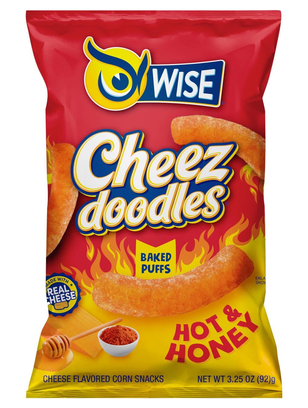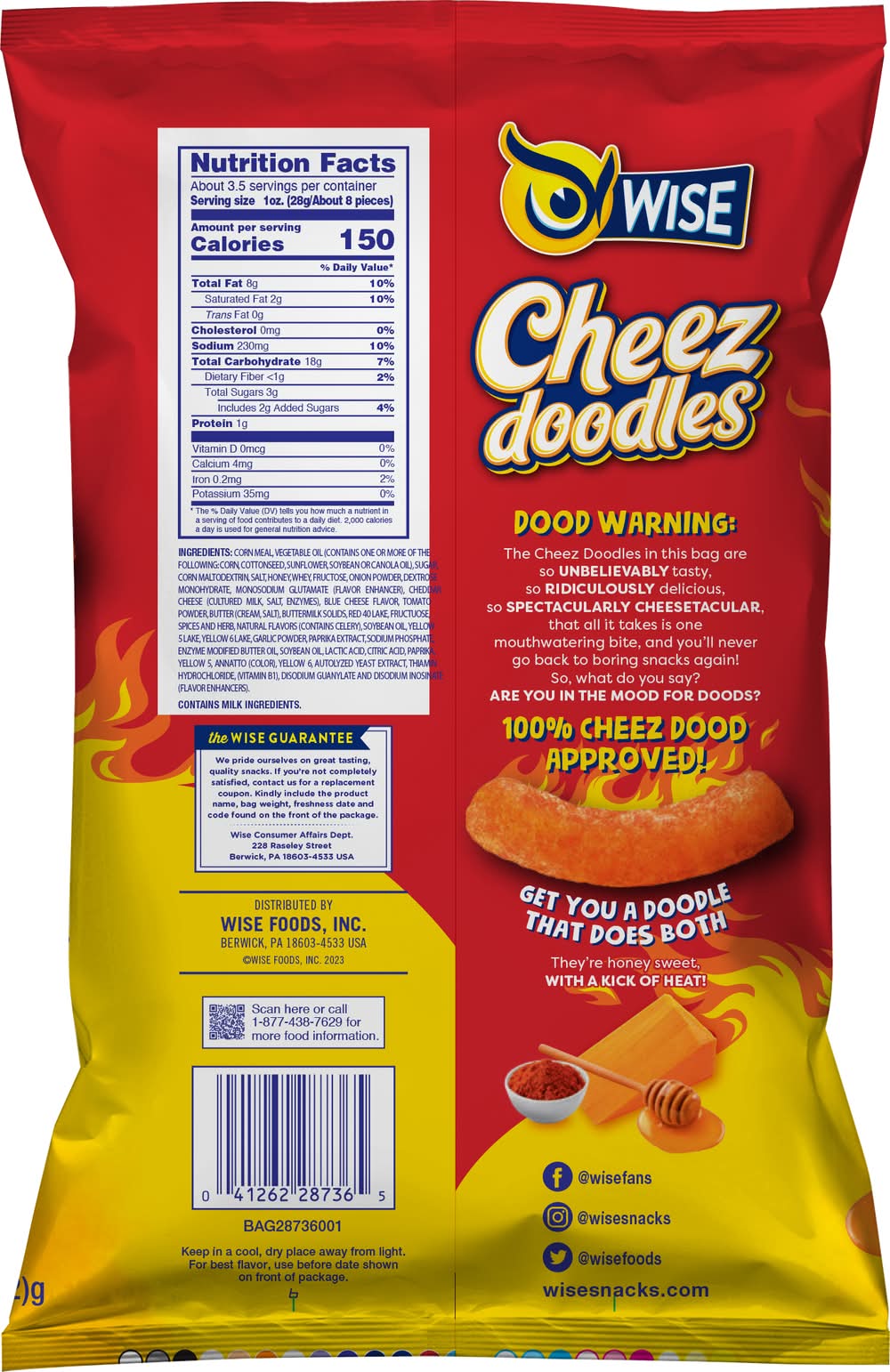 Cheese flavored corn snacks. Remember Recess That time of day when you let loose, hung out with your friends and had no worries Well, it still exists inside every bag of delicious Cheez Doodles. Tear one open and find out. We double dog dare you. Sweet with a kick of heat! Kick your day up a notch with hot & honey. Always endorsed by the cheez doods The Wise Guarantee: We pride ourselves on great tasting, quality snacks. If you're not completely satisfied, contact us for a replacement coupon. Flavor: Cheese