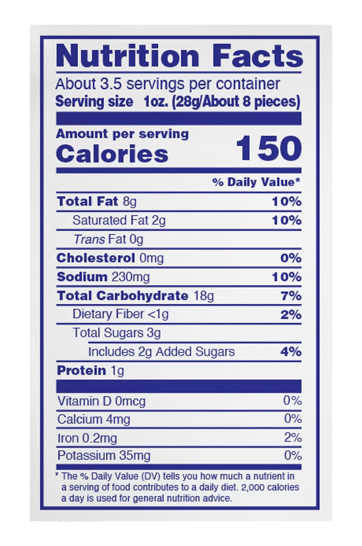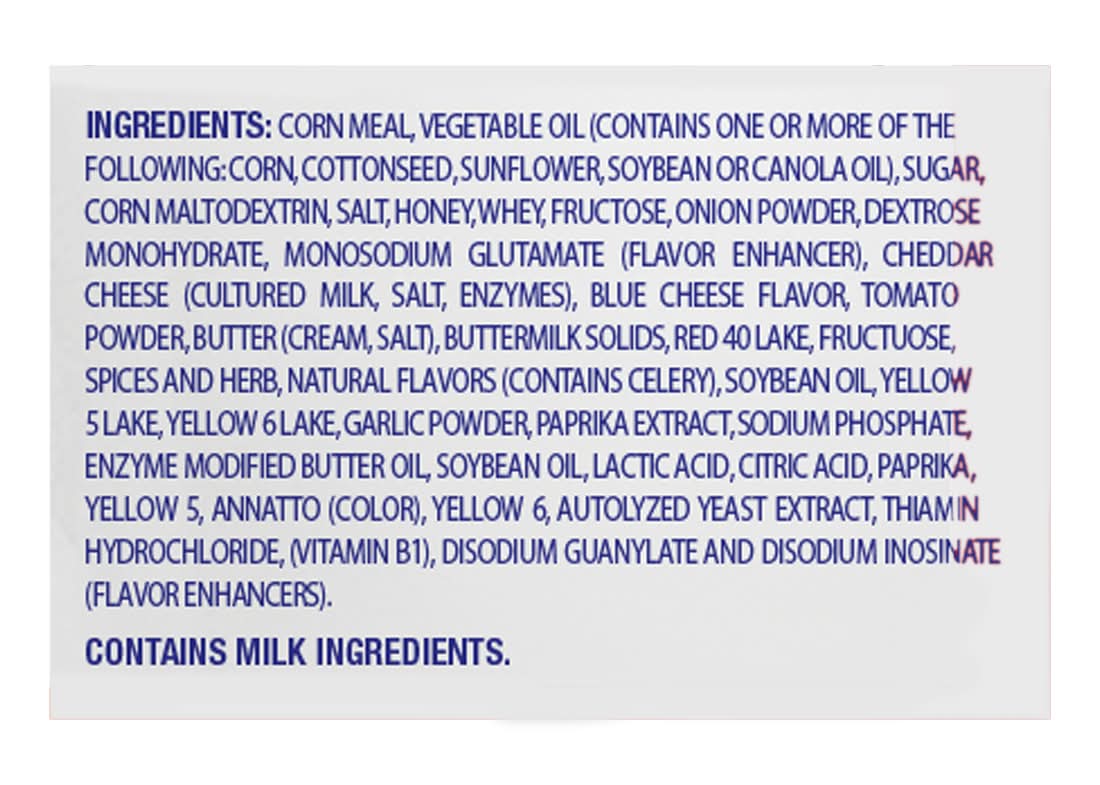 Ingredients: Corn Meal, Vegetable Oil (Contains One Or More Of The Following: Corn, Cottonseed, Sunflower, Soybean Or Canola Oil), Sugar, Corn Maltodextrin, Salt, Honey, Whey, Fructose, Onion Powder, Dextrose Monohydrate, Monosodium Glutamate (Flavor Enhancer), Cheddar Cheese (Cultured Milk, Salt, Enzymes), Blue Cheese Flavor, Tomato Powder, Butter (Cream, Salt), Buttermilk Solids, Red 40 Lake, Fructuose Spices And Herb, Natural Flavors (Contains Celery), Soybean Oil, Yellow 5 Lake, Yellow 6 Lake, Garlic Powder, Paprika Extract, Sodium Phosphate Enzyme Modified Butter Oil, Soybean Oil, Lactic Acid, Citric Acid, Paprika, Yellow 5, Annatto (Color), Yellow 6, Autolyzed Yeast Extract, Thiamin Hydrochloride, (Vitamin B1), Disodium Guanylate And Disodium Inosinate (Flavor Enhancers) Contains: Milk, Soybeans, Corn, Celery