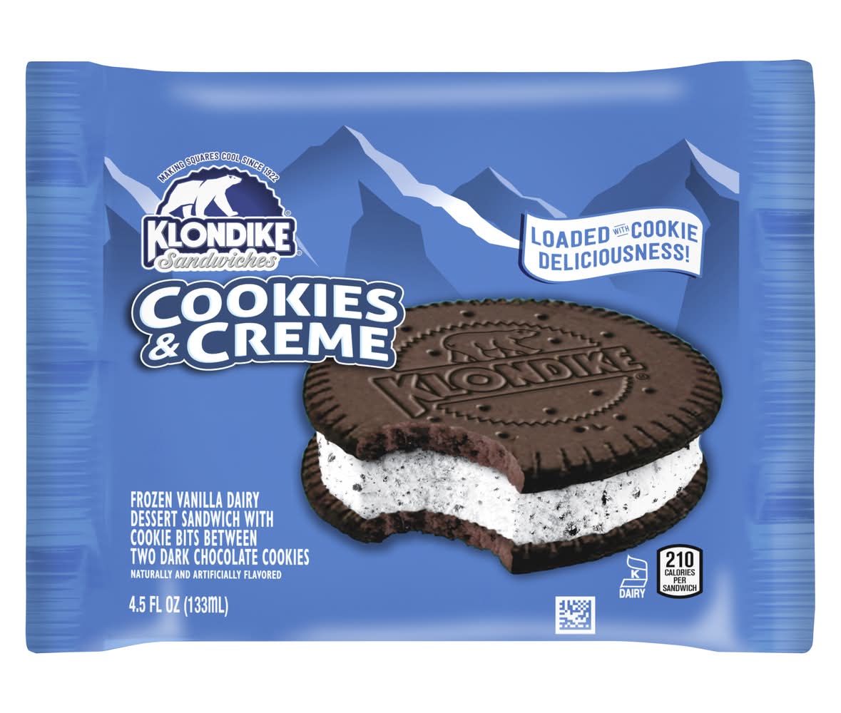 Klondike Frozen Dairy Dessert Sandwich Cookies and Creme, 4.5 fl oz1 Count • Number of servings: 1 • Unilever, Englewood Cliffs, NJ, 07632, Ph: 800-931-2830 • Packaging: Reusable
