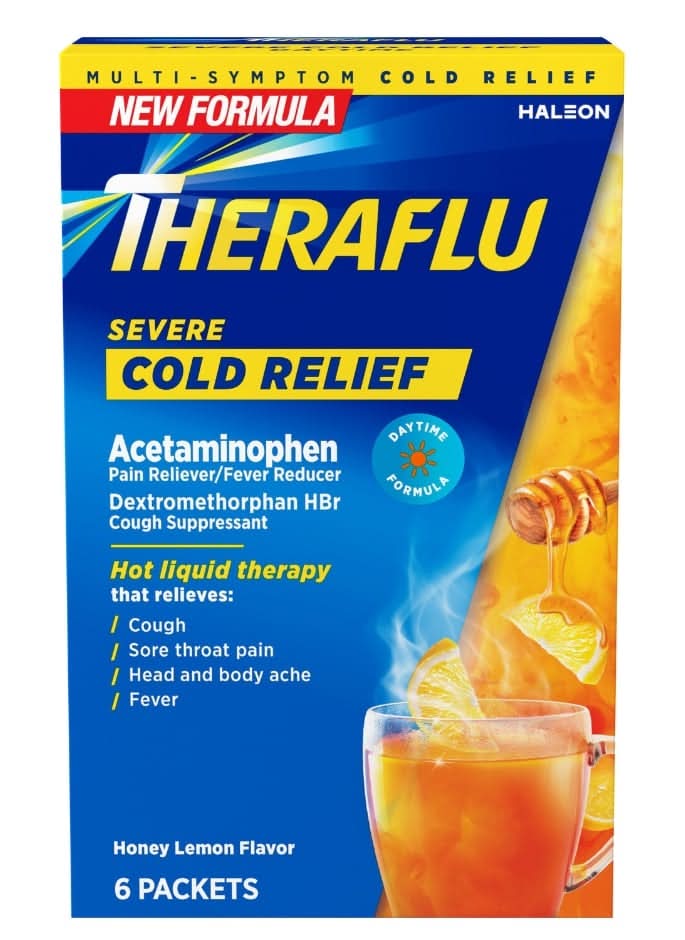 Theraflu Daytime Severe Cold Relief Powder helps defeat your worst cold and flu symptoms. Infused with green tea and honey lemon flavors, this Theraflu powder dissolves instantly in hot water to create a comforting yet powerful multi-symptom cold medicine for adults. Every sip of this cough, cold and sore throat pain medicine provides a warm wave of powerful pain relief, headache relief, body ache relief, and cough relief, so you can feel better and move on with your day. Each dose delivers multi-symptom relief through a combination of dextromethorphan HBr, a cough suppressant and acetaminophen, a pain reliever and fever reducer. Preparing a hot mug of this Theraflu cold and cough medicine is as easy as making a cup of coffee or tea. Simply dissolve the contents of one of these flu and cold relief packets in 8 ounces of hot water, and drink while warm. Take this cough and cold medicine every four hours as needed for cold and flu symptom relief. Get powerful relief so you can recover with an easy-to-make, soothing cup of Theraflu.