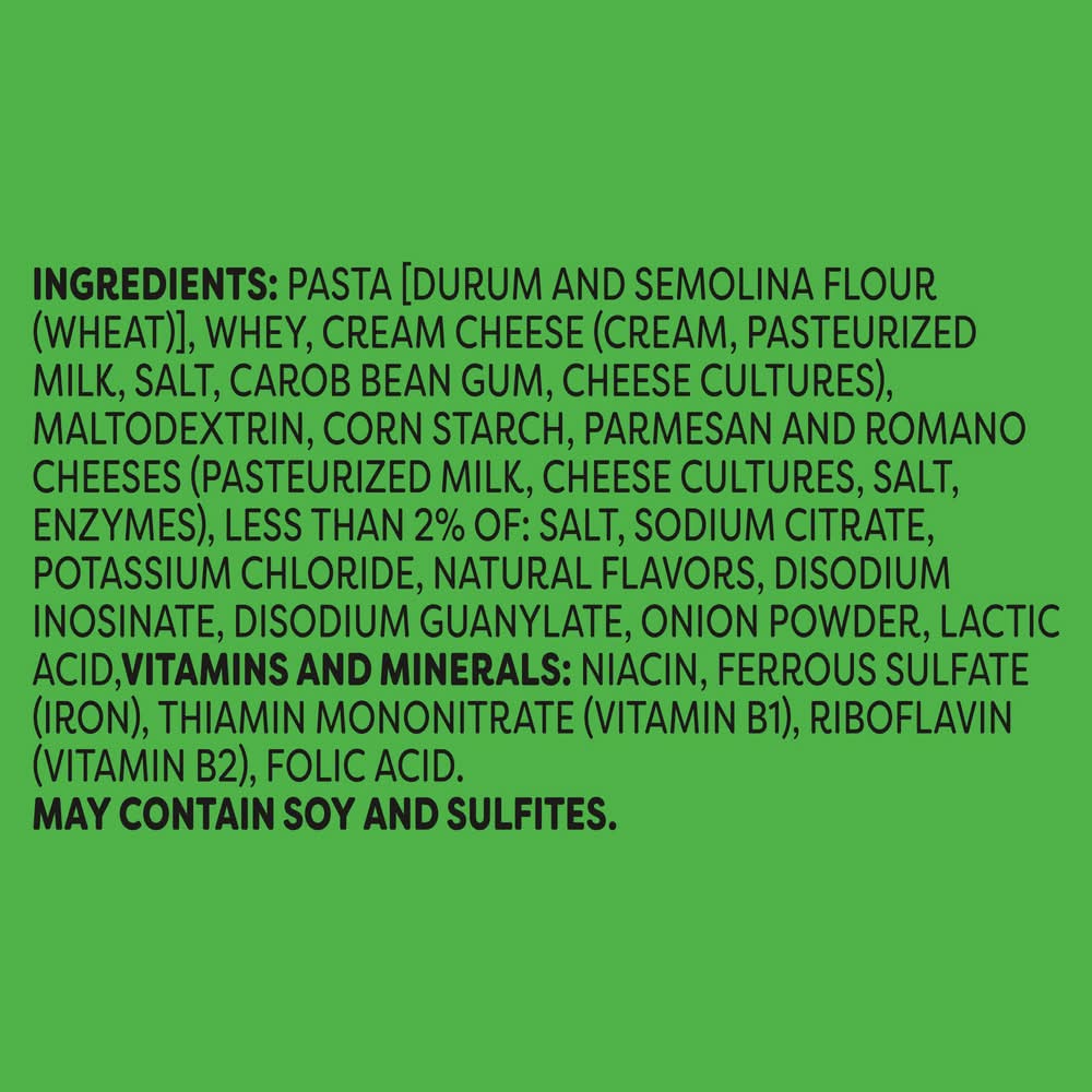 Ingredients: Pasta [Durum and Semolina Flour Wheat], Whey, Cream Cheese Cream, Pasteurized Milk, Salt, Carob Bean Gum, Cheese Cultures, Maltodextrin, Corn Starch, Parmesan and Romano Cheeses Pasteurized Milk, Cheese Cultures, Salt, Enzymes, Less than 2% of: Salt, Sodium Citrate, Potassium Chloride, Natural Flavors, Disodium Inosinate, Disodium Guanylate, Onion Powder, Lactic Acid, Vitamins and Minerals: Niacin, Ferrous Sulfate Iron, Thiamin Mononitrate Vitamin B1, Riboflavin Vitamin B2, Folic Acid. Contains: wheat