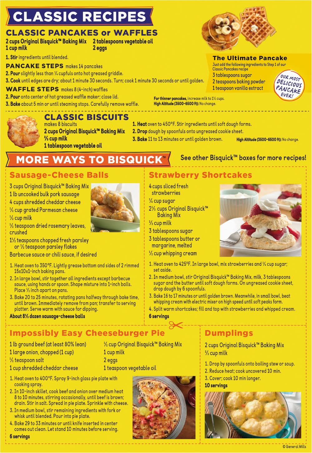 Classic pancakes: makes 14 pancakes. you will need: 2 cups original bisquick mix; 1 cup milk; 2 eggs. 1) stir ingredients until blended. 2) pour slightly less than 1/4 cupfuls onto hot greased griddle. 3) cook until edges are dry. turn; cook until golden. high altitude (3500-6500 ft): no change. for thinner pancakes, increase milk to 1-1/3 cups. our most delicious pancake ever! waffles: makes 12 (4-inch) waffles: you will need: 2 cups original bisquick mix; 1-1/3 cups milk; 2 tbsp vegetable oil; 1 egg. 1) stir ingredients until blended. 2) pour onto center of hot greased waffle maker; close lid. 3) bake about 5 min or until steaming stops. carefully remove waffle. high altitude (3500-6500 ft): no change. biscuits: makes 8 biscuits. 2-1/4 cups original bisquick mix; 2/3 cup milk. 1) heat oven to 450 degrees f. stir ingredients until soft dough forms. 2) drop dough by spoonfuls onto ungreased cookie sheet. 3) bake 8 to 10 minutes or until golden brown. high altitude (3500-6500 ft): no change. make it your own: stir 1 of your favorites into the bisquick pancake or waffle recipe. make it moist: add 2/3 cup vanilla yogurt. make it nutty: add 1/4 cup peanut butter. make it awesome: add 6 slices cooked bacon, chopped. have more fun: add 2 tbsp candy sprinkles. just enough spice: add 1 tsp ground cinnamon. make it hearty: add 1/2 cup quick cooking oats. to reduce fat and cholesterol in your favorite bisquick recipes: use skim milk in place of whole or low-fat milk. use margarine in place of butter. use egg whites or egg substitute for whole eggs (1 large egg = 2 egg whites or 1/4 cup egg substitute). to measure bisquick mix: spoon into dry-ingredient measuring cup; level with knife. do not sift.