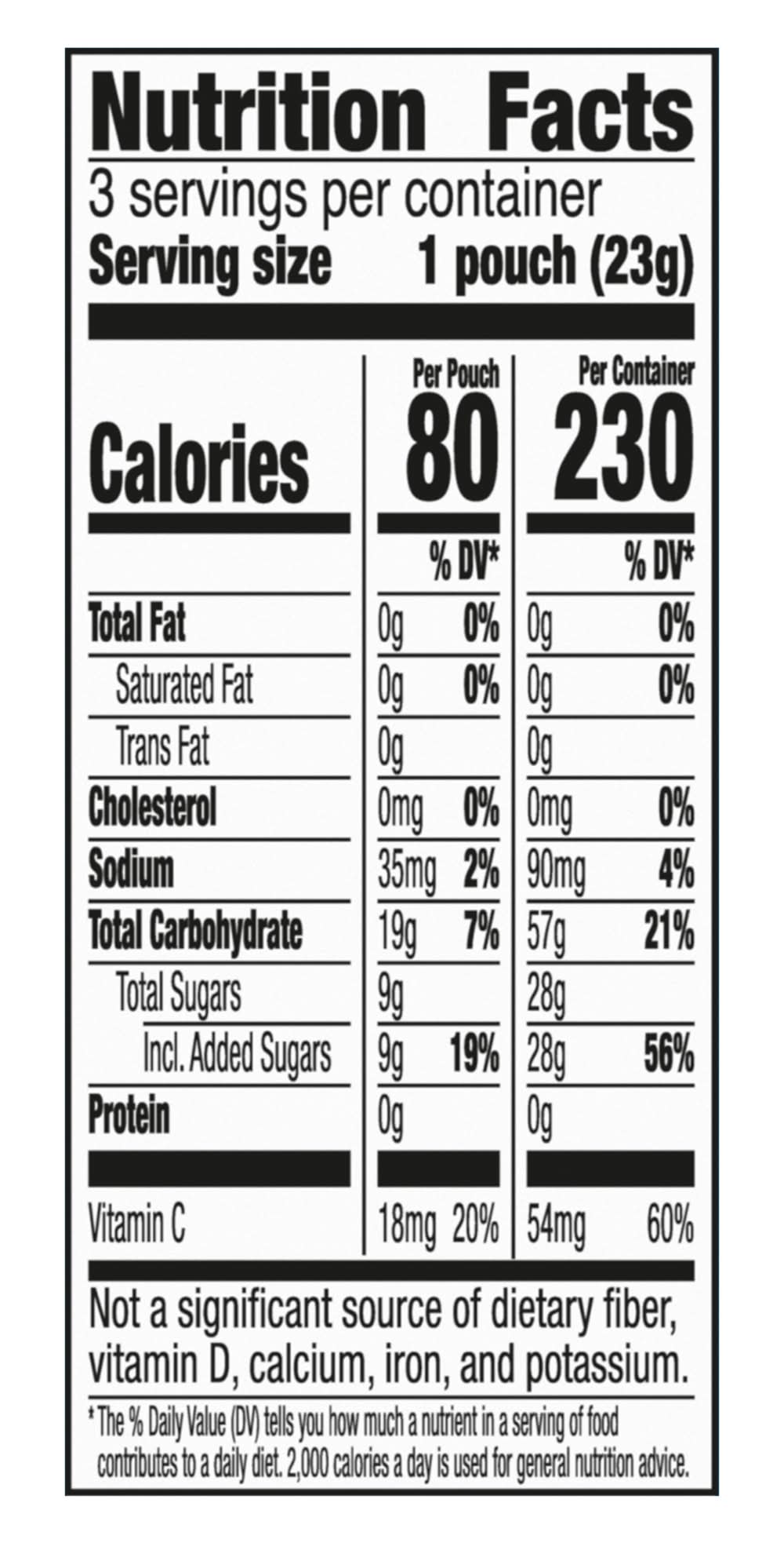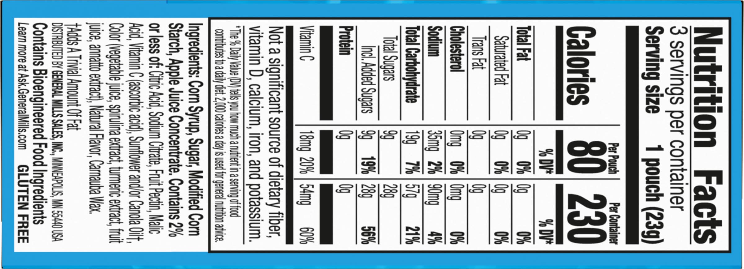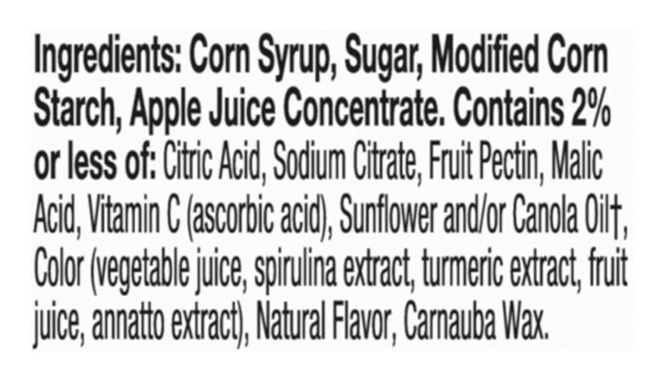 Ingredients: Corn Syrup, Sugar, Modified Corn Starch, Apple Juice Concentrate, Contains 2% or Less of: Citric Acid, Sodium Citrate, Fruit Pectin, Malic Acid, Vitamin C (Ascorbic Acid), Sunflower and/or Canola Oil (a), Color (Vegetable Juice, Spirulina Extract, Turmeric Extract, Fruit Juice, Annatto Extract), Natural Flavor, Carnauba Wax. (a) Adds a Trivial Amount of Fat