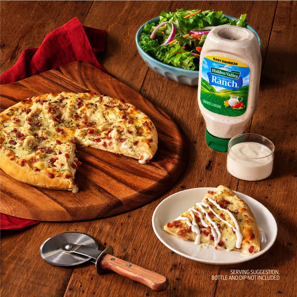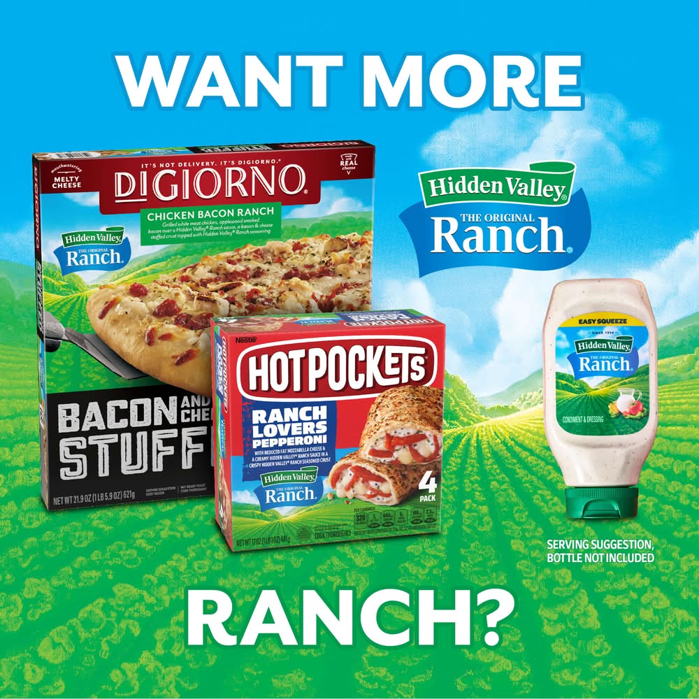 Two culinary legends are coming together to take a classic combo to a whole new level. DiGiorno took the flavors you love from a classic stuffed crust chicken bacon ranch pizza and combined them with a Hidden Valley Ranch sauce – delivering the perfect ranch pizza! If you already love dipping your pizza in ranch, you're going to love ranch baked into your pizza even more, enjoy the perfect fusion right on your DiGiorno pizza! Experience savory flavors fresh out of the oven -- made with real cheese, white meat chicken, applewood smoked bacon over a Hidden Valley Ranch sauce. This frozen pizza is easy to make and will be ready to eat in around 23 minutes. For those who love stuffed crust pizza and Hidden Valley Ranch, this one’s for you. • Nestle USA, Inc., Solon, OH, 44139, • Packaging: Reusable