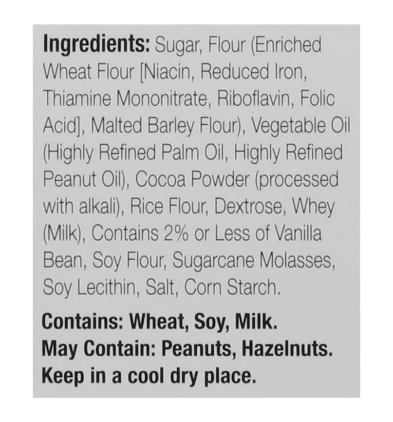 Ingredients: Sugar, Flour (Enriched Wheat Flour [Niacin, Reduced Iron, Thiamine Mononitrate, Riboflavin, Folic Acid], Malted Barley Flour), Vegetable Oil (Highly Refined Palm Oil, Highly Refined Peanut Oil), Cocoa Powder (Processed with Alkali), Rice Flour, Dextrose, Whey (Milk), Contains 2% or Less of Vanilla Bean, Soy Flour, Sugarcane Molasses, Soy Lecithin, Salt, Corn Starch Contains: Wheat, Soybeans, Milk, Peanuts, Tree Nuts