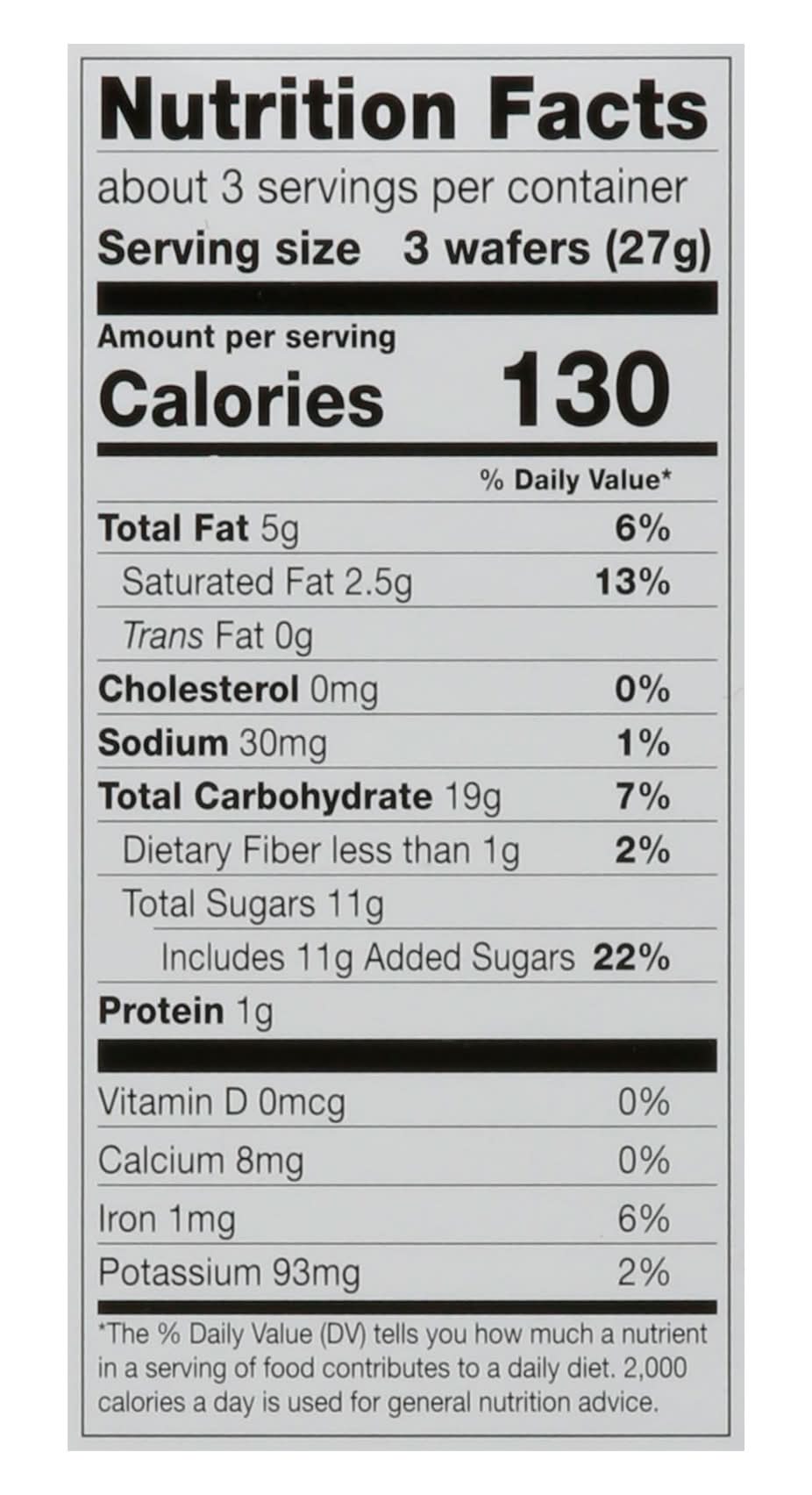 Creme Filled Wafers, Dark Chocolate • Number of servings: 3 • Peter DeBeukelaer Baking Company, Madison, MS, 39110, Ph: 601-856-7454 • Packaging: Reusable