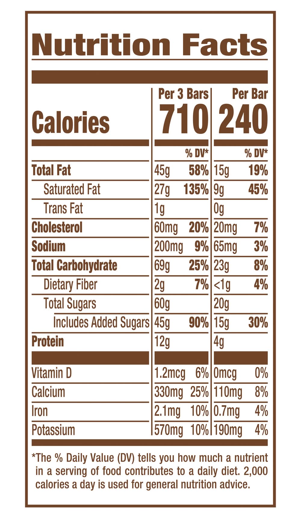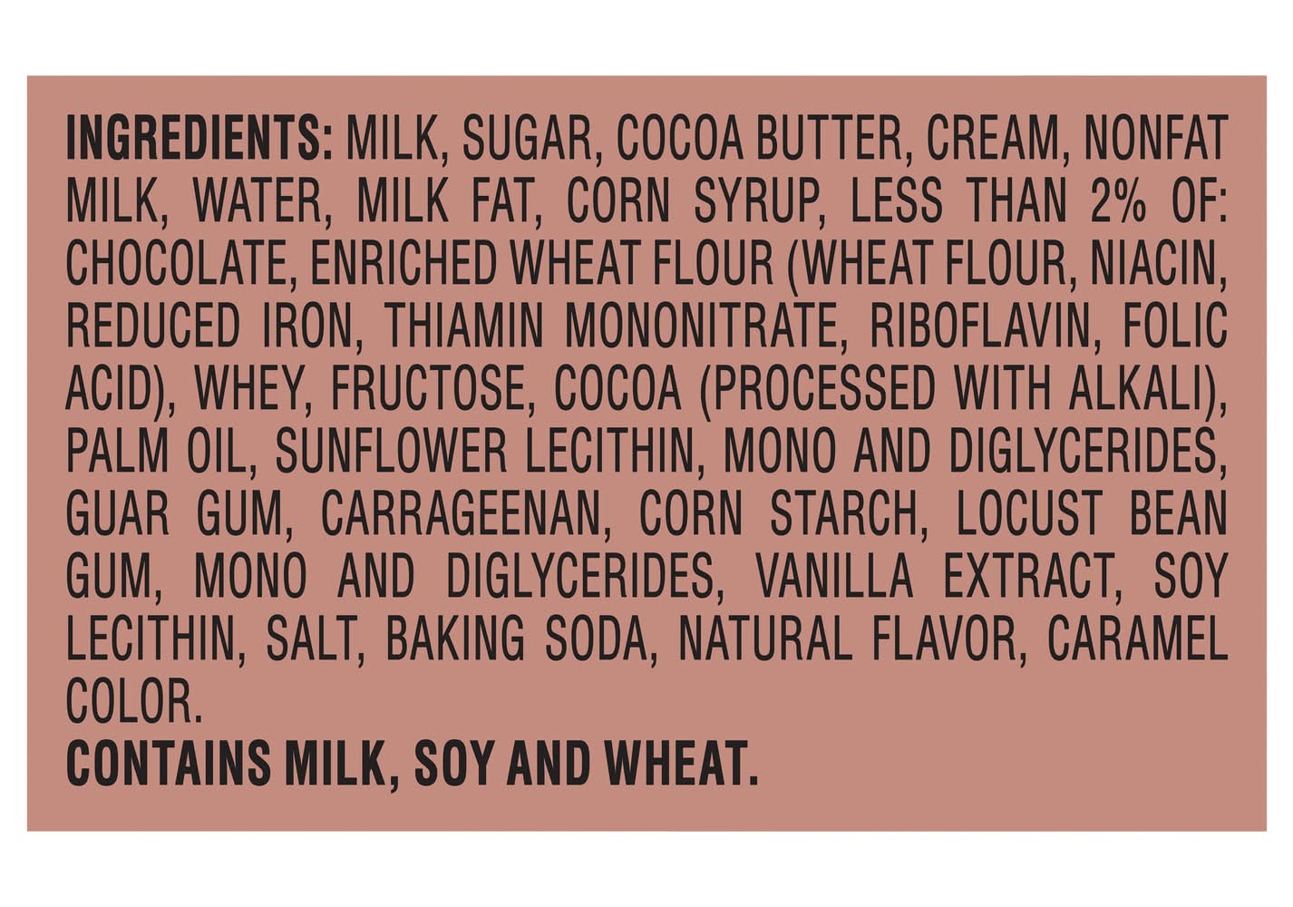 Ingredients: Milk, Sugar, Cocoa Butter, Cream, Nonfat Milk, Water, Milk Fat, Corn Syrup, Less than 2% of: Chocolate, Enriched Wheat Flour (Wheat Flour, Niacin, Reduced Iron, Thiamin Mononitrate, Riboflavin, Folic Acid), Whey, Fructose, Cocoa (Processed with Alkali), Palm Oil, Sunflower Lecithin, Mono and Diglycerides, Guar Gum, Carrageenan, Corn Starch, Locust Bean Gum, Mono and Diglycerides, Vanilla Extract, Soy Lecithin, Salt, Baking Soda, Natural Flavor, Caramel Color. Contains: Milk, Soybeans, Wheat