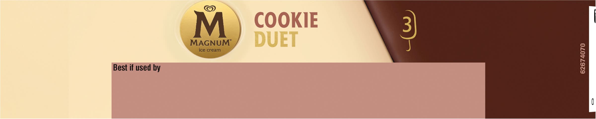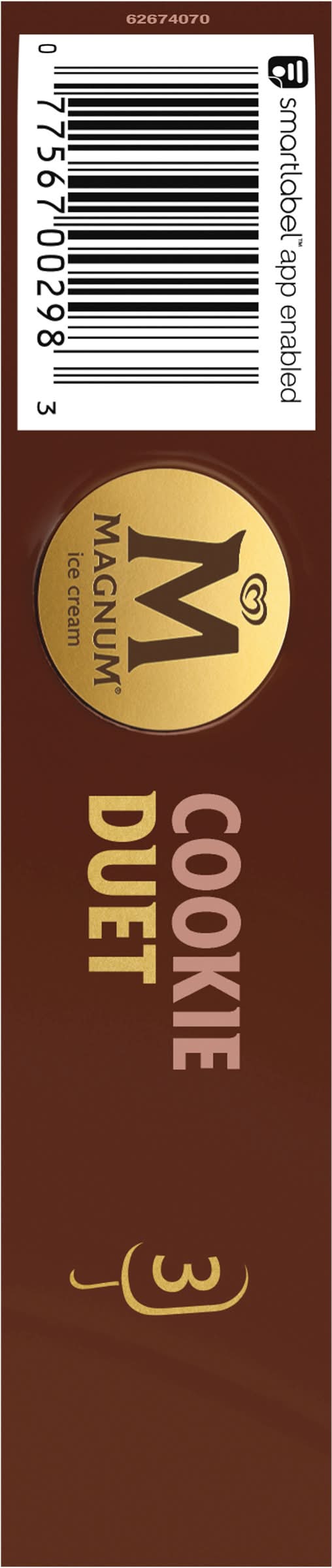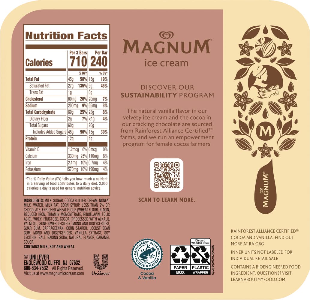 Magnum Cookie Duet Ice Cream bars offer the ultimate indulgence. Each ice cream bar is made with velvety smooth vanilla ice cream and is fully dipped in white chocolate with dark chocolate cookie pieces and half dipped in milk chocolate and a chocolate ganache swirl, just the right amount of chocolate for you to enjoy. The result is a frozen treat, the perfect combination of delicious flavors and textures in every bite. Magnum Ice Cream Cookie Duet Bars are a delight for the senses: Fully dipped in white chocolate with dark chocolate cookie pieces, and half dipped in milk chocolate and a chocolate ganache swirl. Our dark chocolate is made with cocoa beans sourced from Rainforest Alliance Certified farms. Belgian chocolate is renowned for its smooth, rich flavor and decadent texture, and its recognized around the world because of its meticulous adherence to Old World craftsmanship. That makes it perfect for our ice cream bars because we craft our premium ice cream bars in accordance with this rich heritage, using a signature Belgian chocolate recipe developed specifically for us. While still warm, this delicious chocolate coating wraps around our velvety ice creams, instantly cooling to form our signature thick, crackly chocolate shell. With flavors ranging from intense to sweet to salty to dark, Magnum Ice Cream is sure to satisfy your next dessert craving, whatever it is. • Flavor: Cookie duet • Unilever, Englewood Cliffs, NJ, 07632 • Packaging: Reusable
